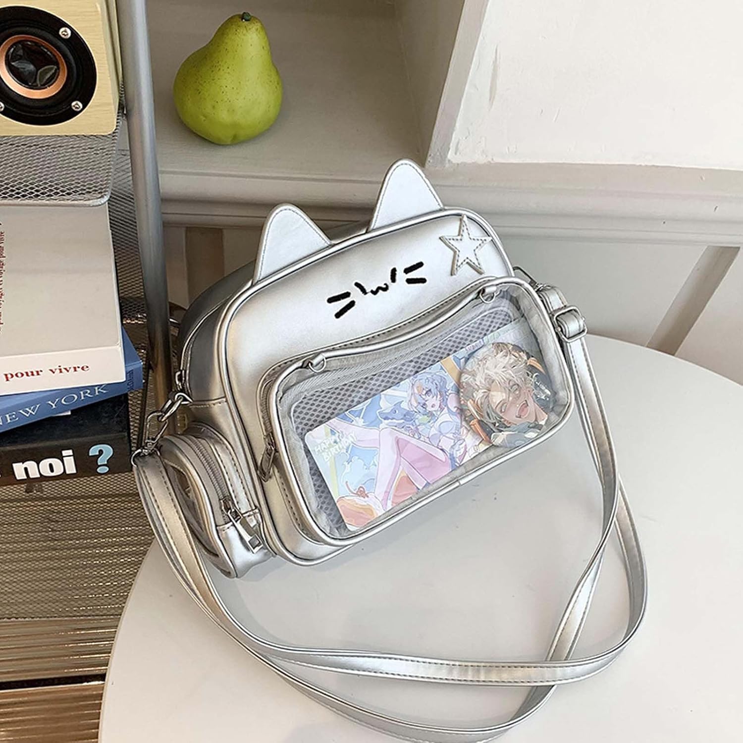 This ita handbag is made of premium PU leather and PVC. All of the zippers work great and open smoothly. Excellent workmanship.The cat backpack features a lively cat face and a pair of cute cat ears. The stylish ita bag combines practicality and cuteness, adding a touch of cuteness to your daily outfit Size: The japanese backpack is 12.2x5.3x8.3 inches. Pin display accessories size is 8.3 x 4.3 inches. The y2k bag spacious interior to carry all your essentials like keychains, mobile phone The cat backpack features a lively cat face and a pair of cute cat ears. The stylish ita bag combines practicality and cuteness, adding a touch of cuteness to your daily outfit Functional and Spacious: Despite its cute exterior, it offers ample storage space with multiple compartments to keep your essentials organized.
