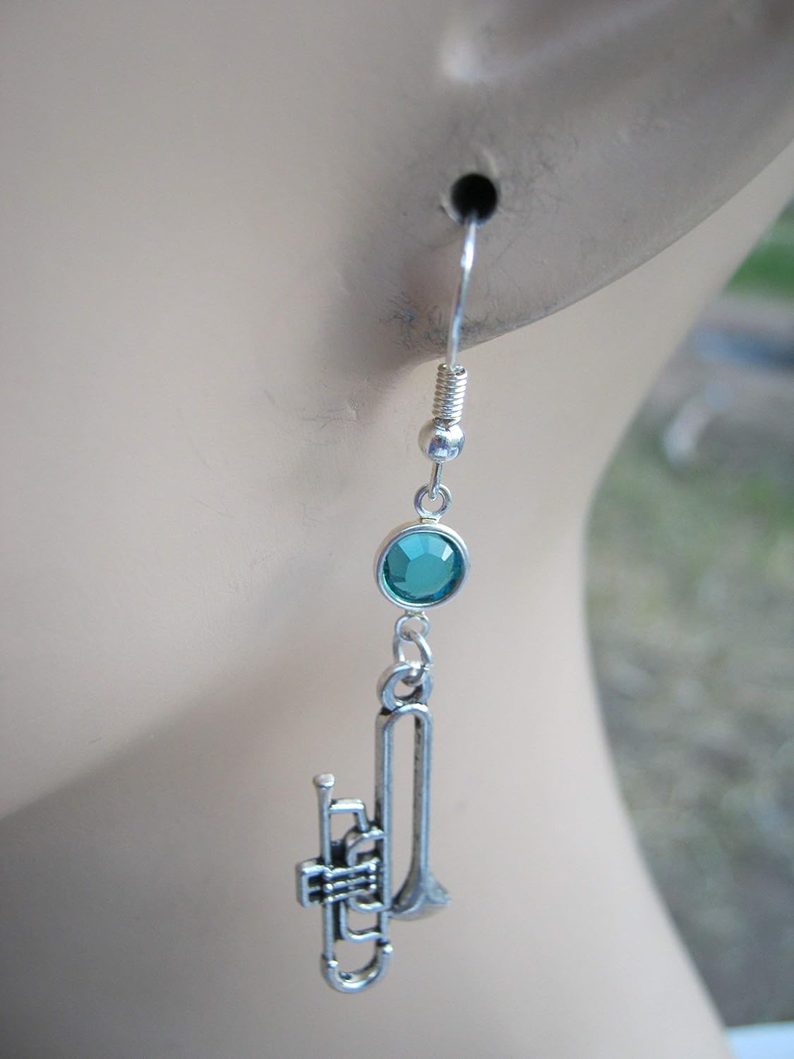 Hand created with Love these Personalized music inspired lead/nickel free Antiqued silver tone Trombone dangle earrings feature birthstone crystal of your choice on your choice of hypoallergenic Stainless steel ear wires or .925 Sterling silver ear wires. --------------------------------------------------------------------------------- Thank You for visiting my shop. Design, Description & Photographs @Abundant Earth Works