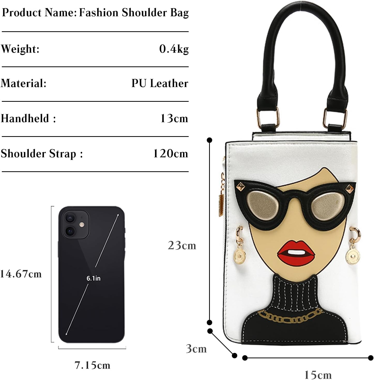 CORIOS Women Novelty 3D Lady Face Handbag PU Leather Shoulder Crossbody Bag➤Exquisite hot stamping process on Surface of the handbag, vivid colors ladies' face make this purse more funky and special.➤Creative round earrings design make this cute handbag has a 3D effect look.➤Quality soft & smooth PU leather material with unique 3D Lady Face design, makes it such a fashion and funky ladies leather purse.➤Made of PU, it looks like an elegant woman wearing fashionable glasses and red lipstick. It looks very cute and interesting.➤Each color of the purse is classy and striking, would easy matching any outfits and occasions. A perfect companion for your daily working, travelling, shopping, dating, etc.➤The handbag is a fantastic gift for any occasion. Perfect for birthdays, anniversaries, engagements, weddings, Mother's Day, Christmas, New Year, Valentine's Day and more!➤Very cute and fun purse! A standout accessory ! You will get so many compliments whenever you carry it.Elegant & Novelty 3D Lady Face Design & Creative Round Earrings Decoration & Retro➤Size: Length: 15cm, Width: 3cm, Height: 23cm➤Material: PU leather➤Weight: 0.4kg➤Detachable Shoulder Strap Length: about 120cm➤Made from high quality PU leather, it is soft and water resistant. Equipped with delicate and durable metal fittings to make the bag even more durable.➤This handbag is adorable and full of personality! The perfect size to hold cell phone, cards and several small necessities.➤There are shoulder strap hooks on the top of the bag, you can attach spare shoulder straps on both sides to use as a shoulder bag or a crossbody bag.
