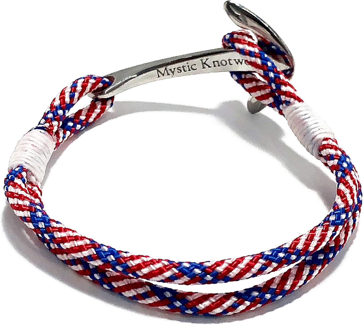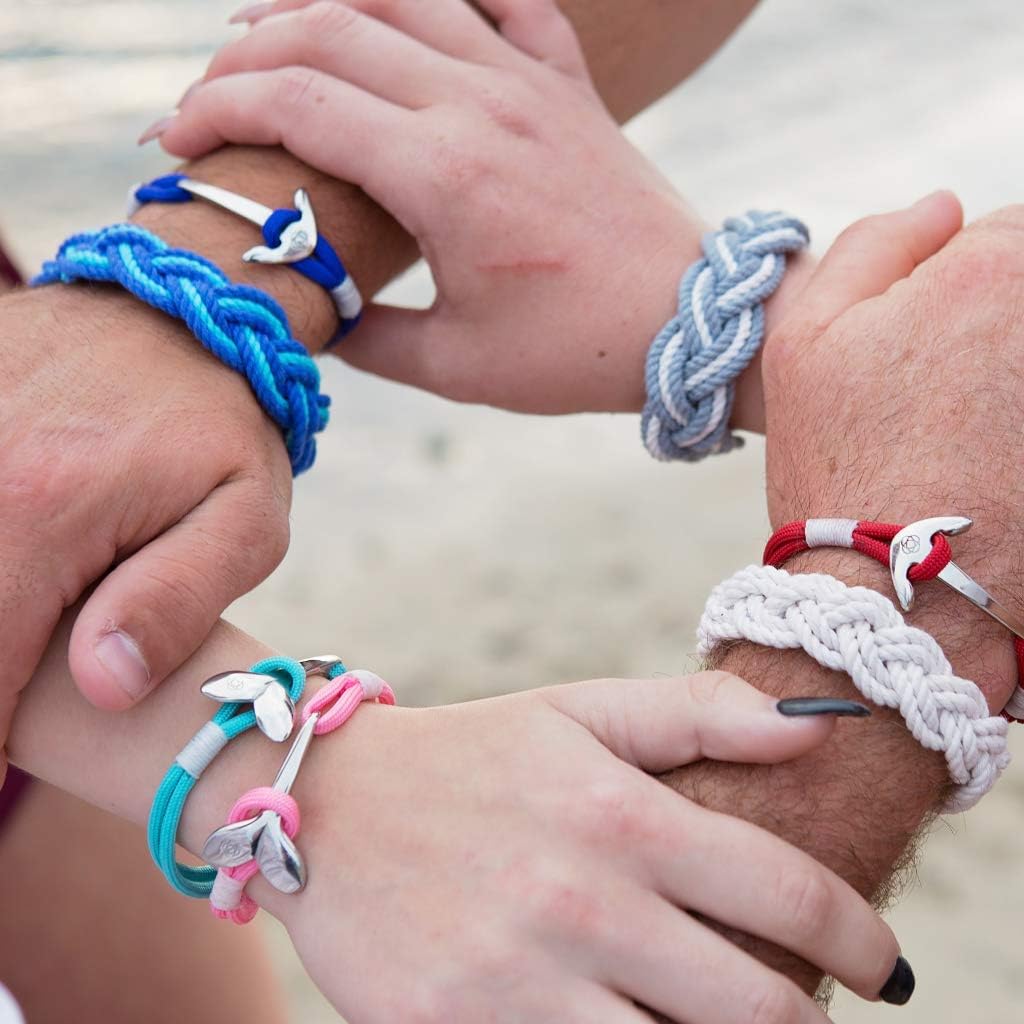 Nautical Anchor Bracelet, Handmade in the USA This anchor is cut from a solid piece of marine grade stainless steel, representing a streamlined take on the nautical tradition. Stainless Steel Anchor (marine grade) Patriotic Abrasion and Weather Resistant Polyester Rope Waxed Whip closure Sizes: Small, Medium, Large Snags, grabs, and scratches...those are complaints we heard about anchor bracelets, and why we hesitated to make them. So, we carefully designed these anchors with a curve to rest on your wrist and not catch on everything or everyone that dares touch them. Sizing: Small fits children or very fine framed women with a wrist size of 5 to 5.75 inches Medium fits women and some men with a wrist size of 6 to 6.75 inches Large fits men with a wrist size of 7 to 8 inches
