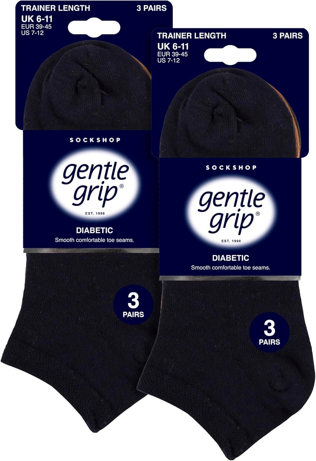 Gentle Grip - Men’s 6 Pack Diabetic Trainer SocksDiscover the ultimate solution for diabetic foot care with Gentle Grip's specially crafted diabetic socks for women. Engineered by technical experts, these Gentle Grip Diabetic Trainer socks offer a tailored approach to diabetic foot health with a low cut trainer length, perfect for the Spring & Summer seasons.Experience unparalleled comfort with these luxuriously soft cotton-rich socks, meticulously designed to securely hold ankles without elastication, eliminating the tightness that can pose problems for those with circulatory issues.Featuring hand-linked toes for smooth seams, these socks prioritise comfort for diabetics, preventing irritation and soreness. Choose these lightweight Gentle Grip diabetic trainer socks to care for your legs every day. They’re available in loads of great colors, including: Khaki, Orange, Blue, Burgundy, Black, Ochre and more in different packs of 6.The specially shaped and woven Honeycomb Tops effortlessly conform to the contours of your ankle, eliminating uncomfortable constriction rings, crucial for diabetic individuals. Trust in Gentle Grip's commitment to comfort and quality, ensuring your feet receive the care they deserve.These socks come in 6 pair packs and are available in 5 different options. They are made from: 77% Cotton, 15% Polyester, 1% Elastane. They come in 2 Men’s Sizes: 7-12 US, 12-15 US and are Machine Washable.Extra Product DetailsGentle Grip Diabetic Trainer SocksNon-Elastic Ankle TopSmooth Toe SeamHoneyComb TopHand Linked Toe SeamSoft Touch CottonDesigned For DiabetesIdeal for Large or Swollen Legs2 Size Options: 7-12 US & 12-15 USMachine Washable