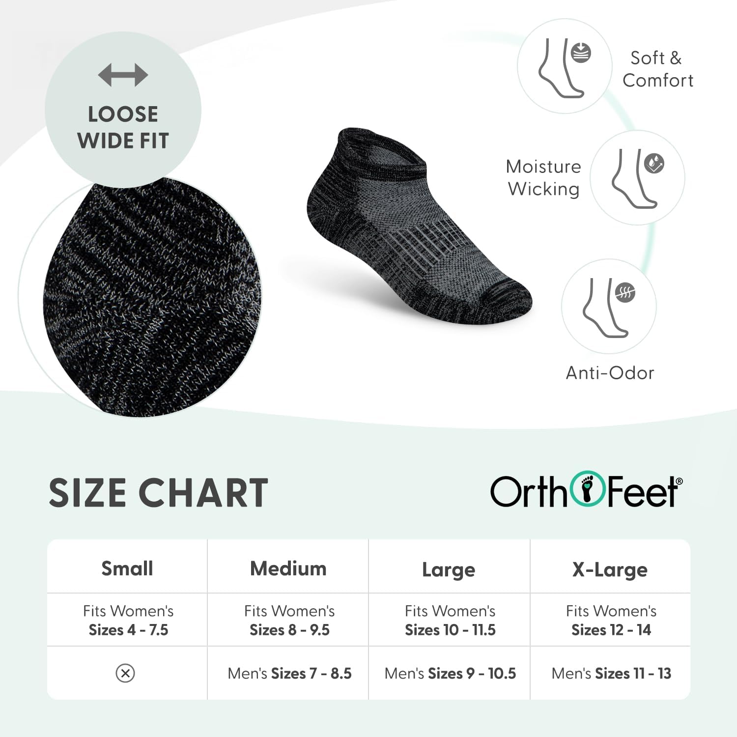 BioSoft(TM) Low Cut socks for women and men by Orthofeet feature seam-free design, excellent moisture wicking system, and soft cushioning interior that offer unsurpassed comfort. Sold in a package of 3 pairs. FEATURES & BENEFITS: Seam-Free - Unique Inverse Linking Design provides virtually seam-free sock interior, offering the ultimate protection against blisters and irritations. /Anti-odor natural properties , and control foot odor. DryPlex(TM). Moisture Wicking System - Keeps feet always dry and comfortable, providing a healthier environment for sensitive diabetic feet. Anti-Blister Soft fibers along with a unique brushing process offer an extremely soft sock interior, minimizing friction, and providing maximum comfort and protection. Soft and Comfortable - fibers feel extremely soft and comfy, eliminating irritation on your skin by reducing shear forces when you walk. FIT: BioSoft(TM) Low Cut socks are thin socks that fit well in dress, casual and athletic shoes. WASHING: Machine wash, warm like colors, tumble dry low. Do not use fabric softeners or chlorine bleach. MATERIALS: 58% Rayon. 23% Cotton. 17% Polyamide. 2% Spandex