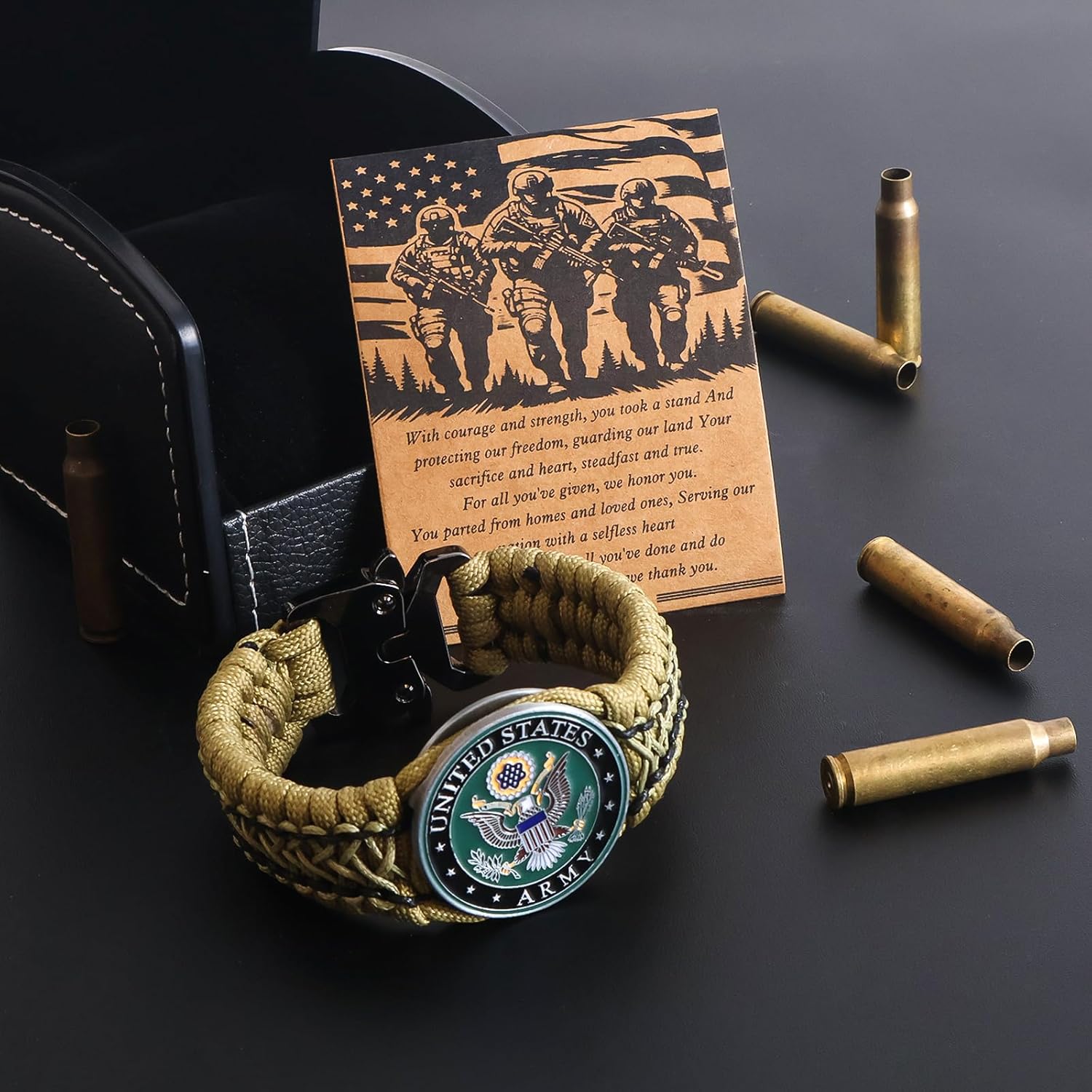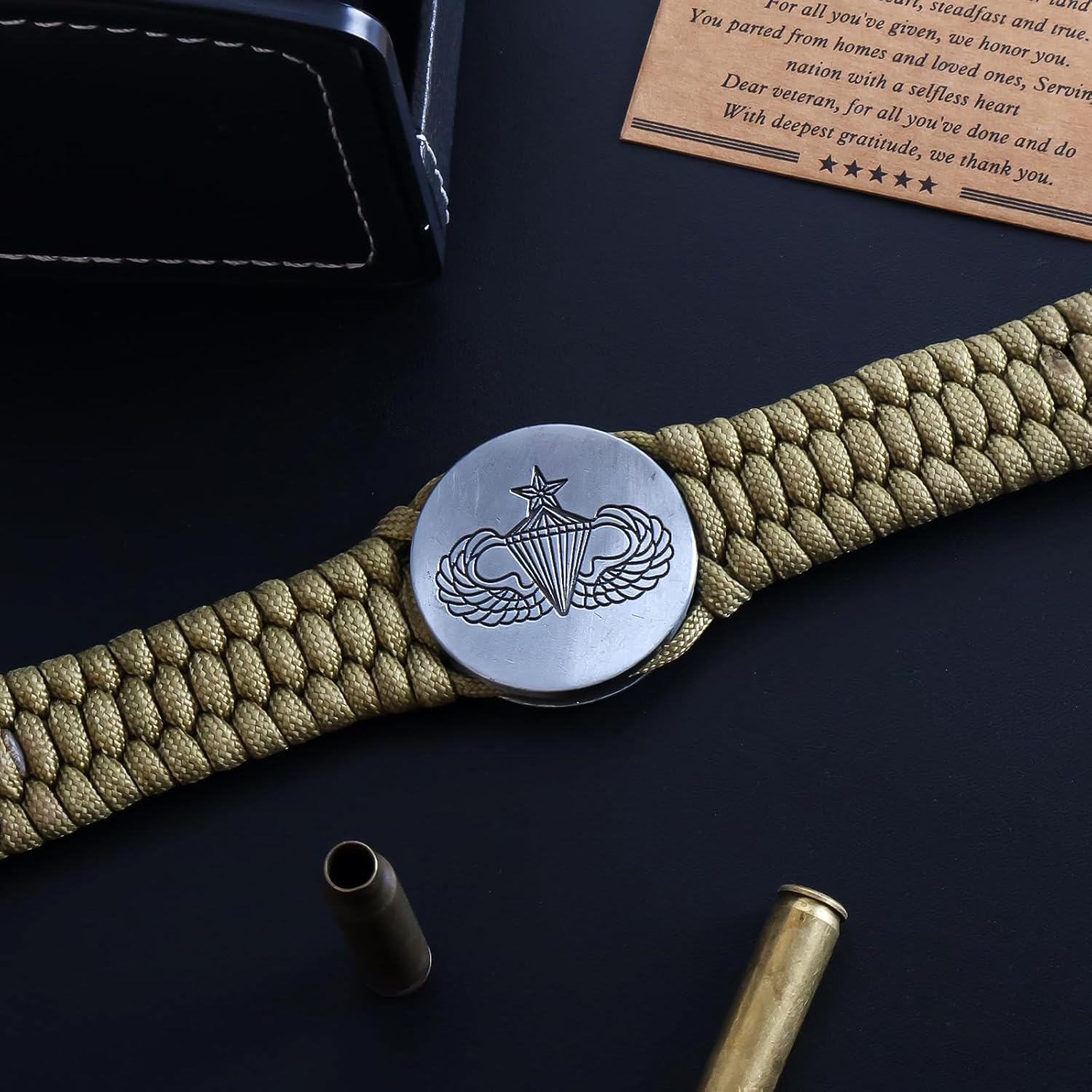 Show your pride and support for the U.S. Army with this distinctive paracord bracelet, a meaningful piece of military-inspired jewelry. Featuring the iconic U.S. Army emblem centerpiece against a durable nylon paracord construction, this unisex bracelet combines style with rugged functionality. The bracelet incorporates a reliable tilt-up clasp mechanism for secure wearing. Perfect as a thoughtful gift for veterans, active service members, or military enthusiasts, this bracelet serves as a powerful symbol of service and dedication. The tactical-style accessory makes an excellent present for fathers, sons, husbands, or grandparents who have served or support our armed forces. The bracelet's robust construction and military-inspired design make it suitable for everyday wear while maintaining its meaningful appearance. Each bracelet represents a connection to the proud tradition of military service and offers a way to display respect for those who serve.