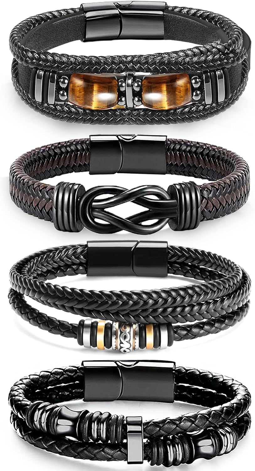 Leather Bracelets for Men Women 4pcs Black Stainless Steel Infinity Mens Bracelet Braided Cuff Bracelets