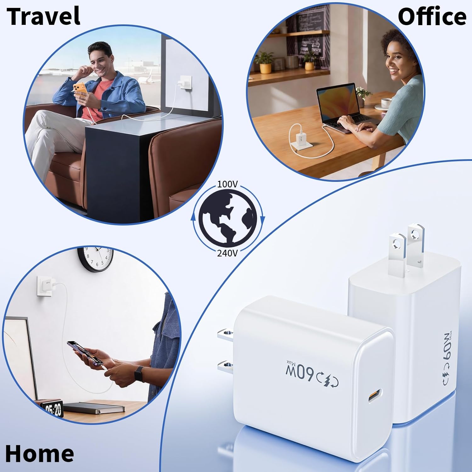 2Pack PD 60W Fast USB C Wall Charger60W USB-C PD 3.0 fast wall charger, can charge your iPhone 17 16 from 0% to 50% in just 30 minutes compared with original 5W charger, 4X faster than 5W iPhone charger which saves more than 1.5 hour for you.Specifications of Apple iPhone Fast Charger:Input : 100-240V ~50/60Hz 1.5AOutput: 5V/3.0ATotal Power Output: 60W MaxColor: WhiteConnector Type: Type CPortable & Compact:- With a lightweight and portable design, the iPhone USB C charger block could meet travel, car, office, and wherever you need to use it.Superior Protection:- Multi-protect safety system ensures complete protection such as built-in short circuit, over current, over voltage and over temperature protection, offers you a safe charging environment.Broad Universal Devices:-iPhone 17/ Air / 17 Pro/ 17 Pro Max-iPhone 16 Pro/ 16 Pro Max/ 16 Plus/ 16/ 16e-iPhone 15 Pro/ 15 Pro Max/ 15 Plus/ 15-iPhone 14 Pro/ 14 Pro Max/ 14 Plus/ 14-iPhone 13 Pro/ 13 Pro Max/ 13 mini/ 13-iPhone 12 Pro/ 12 Pro Max/ 12 mini/ 12-iPhone 11 Pro/ 11 Pro Max/ 11-iPhone XS/ XS Max/ XR/ X/ 8/ 8 Plus/ SE2 7/ 7 Plus-iPhone 6/ 6 Plus/ 6S/ 6S Plus/ 5/ 5C/ 5S/ SE-iPad Pro/ Air/ Mini SeriesPackage included:2 * 60W PD USB-C iPhone Charger Block