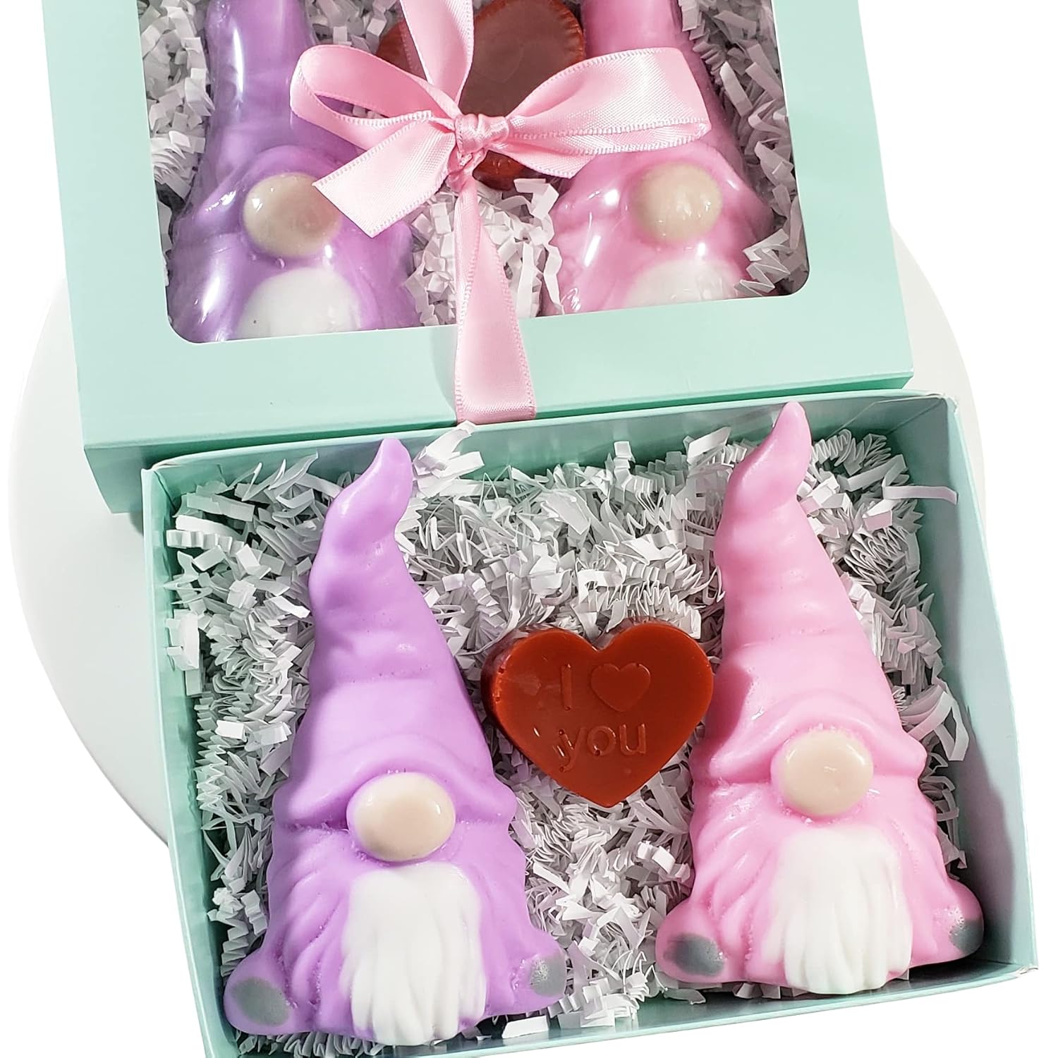 Our Valentine Gnome bath gift set is handmade specifically to bring a smile to their face this Valentine's Day. These glycerin soaps are an original design here at Sunbasil Soap as we made the mold ourselves so you won't find them anywhere else. This Valentine's gift includes both Gnomeo and Juliet soap gnomes with I love you soap heart in between and arrives completely gift boxed.