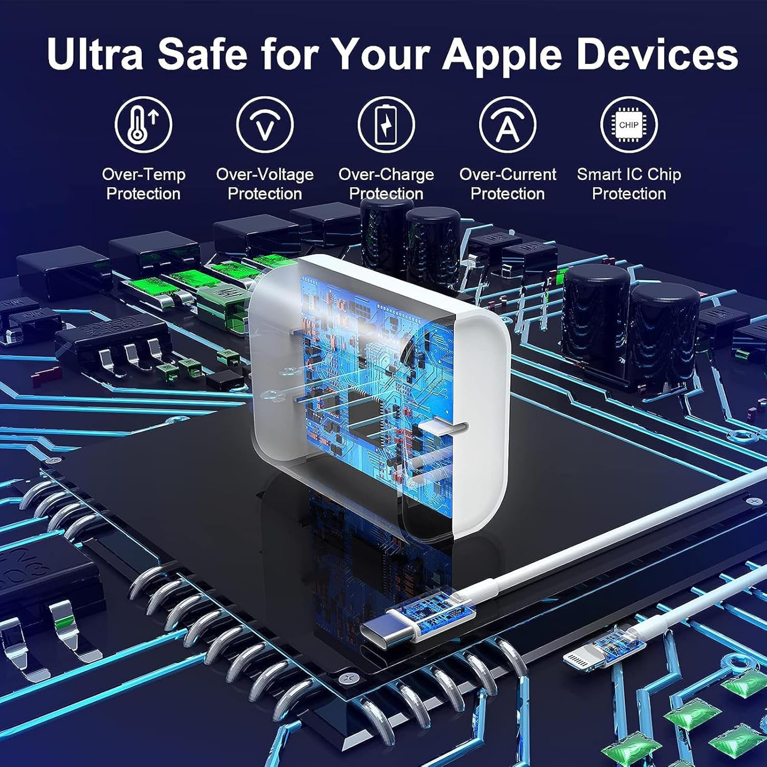 3 Pack [MFi Certified] PD USB-C Wall Charger Plug & 6ft Long Type C to Lightning Cables3.0X Faster Charging Speed & Efficient DataTransmission:Smart Chipset Control Technology, Data Syncing Transferring up to 480Mbps(30MB/S).Fast charge the new iPhone 13 from 0% to 50% in just 30 minutes.Compared with 5W original charger, this PD fast charger for iPhone could save more than 1.5 hour for you!Technical Specifications:USB-C PD3.0 FAST Wall Charger MFi Certified ChipInput Voltage: 100-240V ~ 50-60Hz, 0.6AOutput Power: 5V/3A, 9V/2A, 9V/2.22APower Delivery Fast Charger:iPhone 14/14 Pro/14 Pro MaxiPhone 13/13 Mini/13 Pro/13 Pro MaxiPhone 12/12 Mini/12 Pro/12 Pro MaxAirPods ProiPhone SE 2020iPhone 11/11 Pro/11 Pro MaxiPhone X/XR/XS/XS MaxiPhone 8/8 PlusiPad Pro 10.5"/iPad Pro 11"iPad Mini 5 7.9" and Later ModelsStandard Charge Speed:iPhone 7/7 Plus, 6/6 Plus, 6S/6S Plus, 5/5C/5S/SE, iPad Air/iPad Mini/iPad Pro 9.7"MFi Certified C to Lightning Cable:Built-in the Original MFi Certified C94 Chip and Premium Connector with a Lightning end, Multi-layer signal shielding layer, Supporting for safer PD fast charging, It ensures the iPhone devices can be protected better while charging.Bulit in High-Tech Chip:The updated smart chip in the USB-C power adapter protect your iPhone/iPad/AirPods Pro from overcurrent, over-voltage, short-circuit and overheating, improving the charging efficiency and security.Multi Safety Protection:Safe Certified Charger ensures safety and stability.Built-in intelligent Protocol IC Chip, battery protector and automatic chip recognition functions, Ensuring faster charging while also protecting battery life.What You Get:3* 12W PD 3.0 USB C Wall Charger + 3 * 6FT MFi Certified C to Lightning Cable.