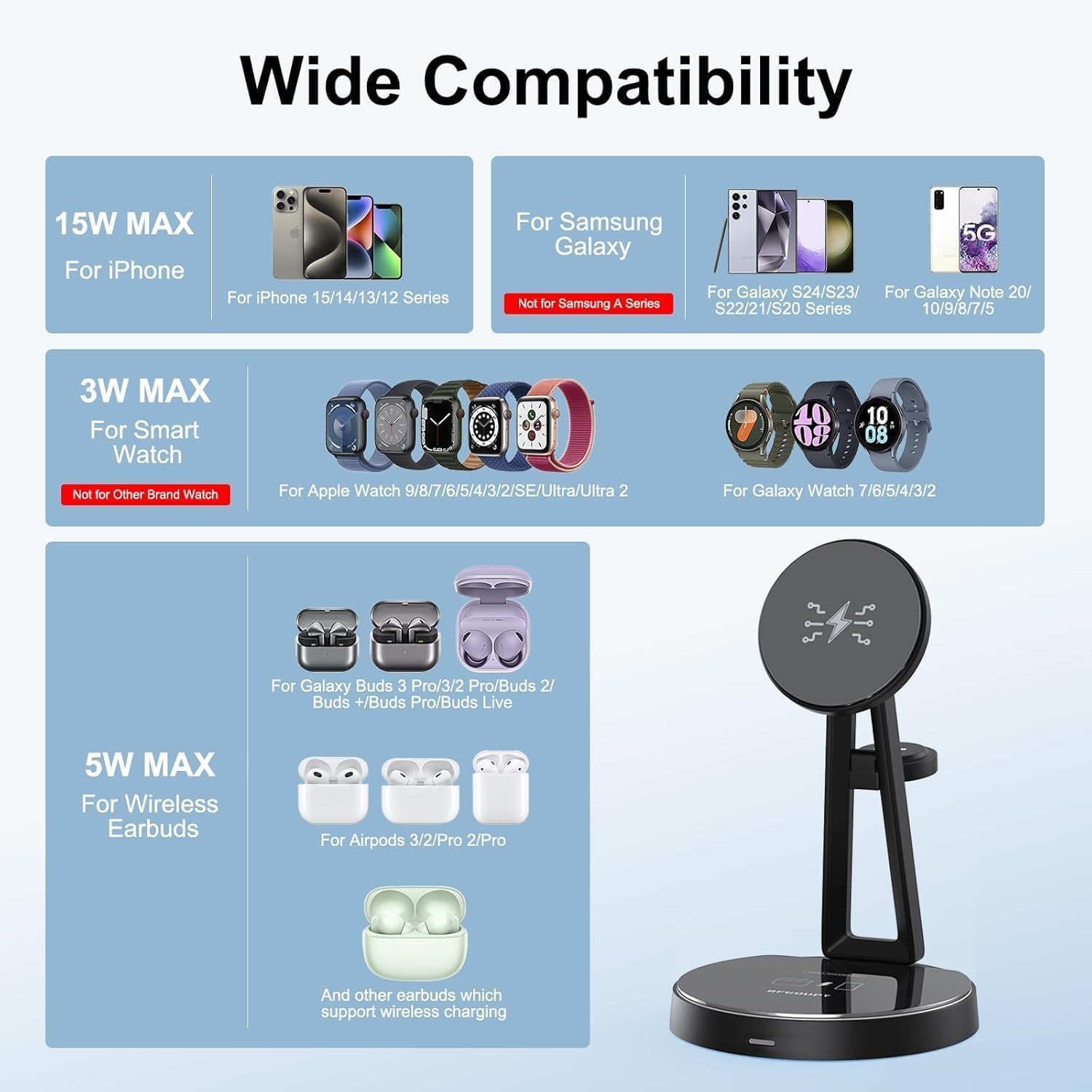 | Compatible Phone Models | for iPhone 17/16/15/14/14 Plus/14 Pro/14 Pro Max/for iPhone 13/13 Pro/13 Pro Max(Not for iPhone 13 Mini)/for iPhone 12/12 Pro/12 Pro Max(Not for iPhone 12 Mini)/iphone 11/Pro/Pro Max/SE/11/11 PRO/11 PRO MAX/8/8 plus/alaxy Note 20 / Note 10 / Note 9 / Note 8 / Note 7/ for Apple Watch 7, iWatch 6, iWatch SE, iWatch 5, iWatch 4, iWatch 3, iWatch 2/ for Airpods 3/2/Pro, Galaxy Buds, and more, Galaxy S25/ S24/ S23/ S22/ S21/ S20 Plus/ S10/ S10 Plus/ S10e/ S9/ S9 Plus |