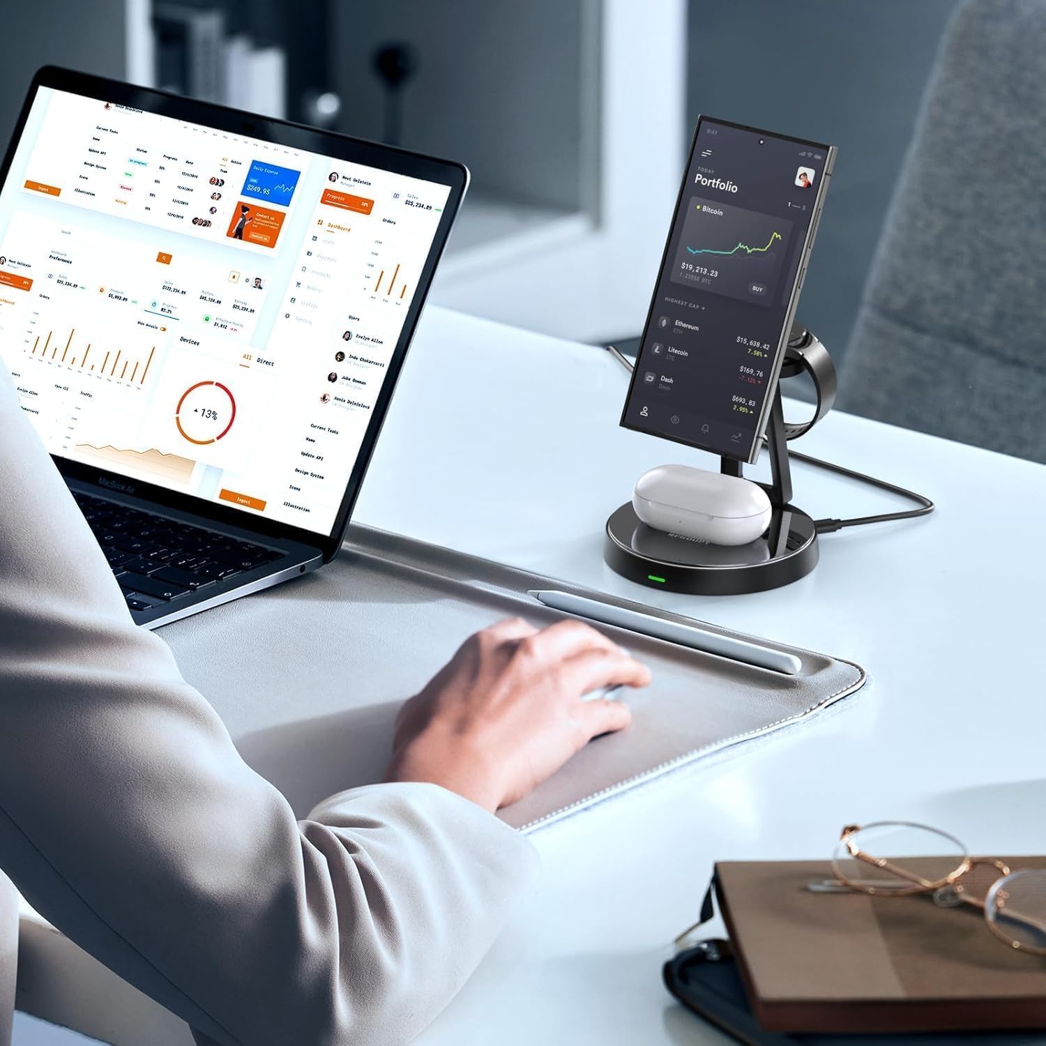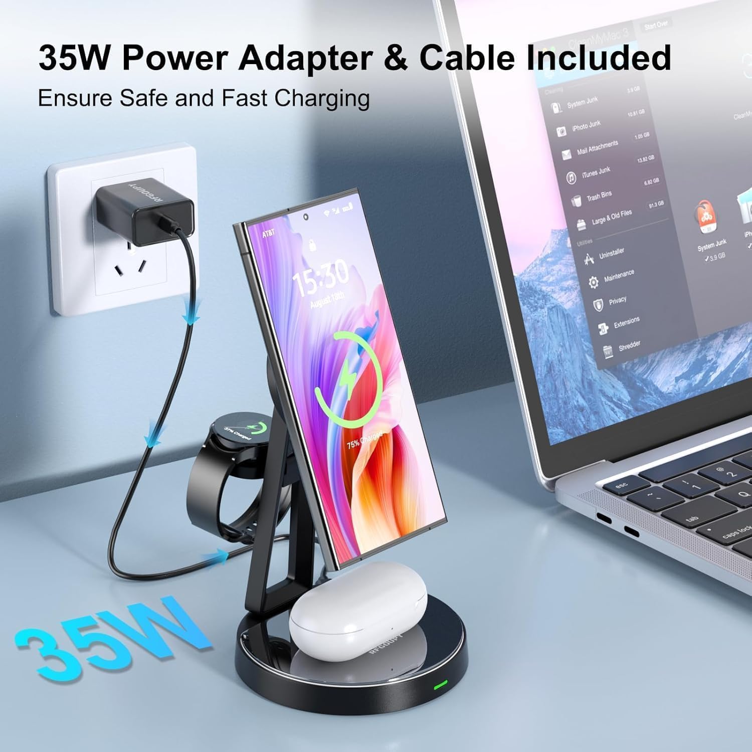 What's in the box 3 in 1 wireless charging station *1, 35W adapter *1, type-c charging cable *1, universal metal ring *1, user manual *1