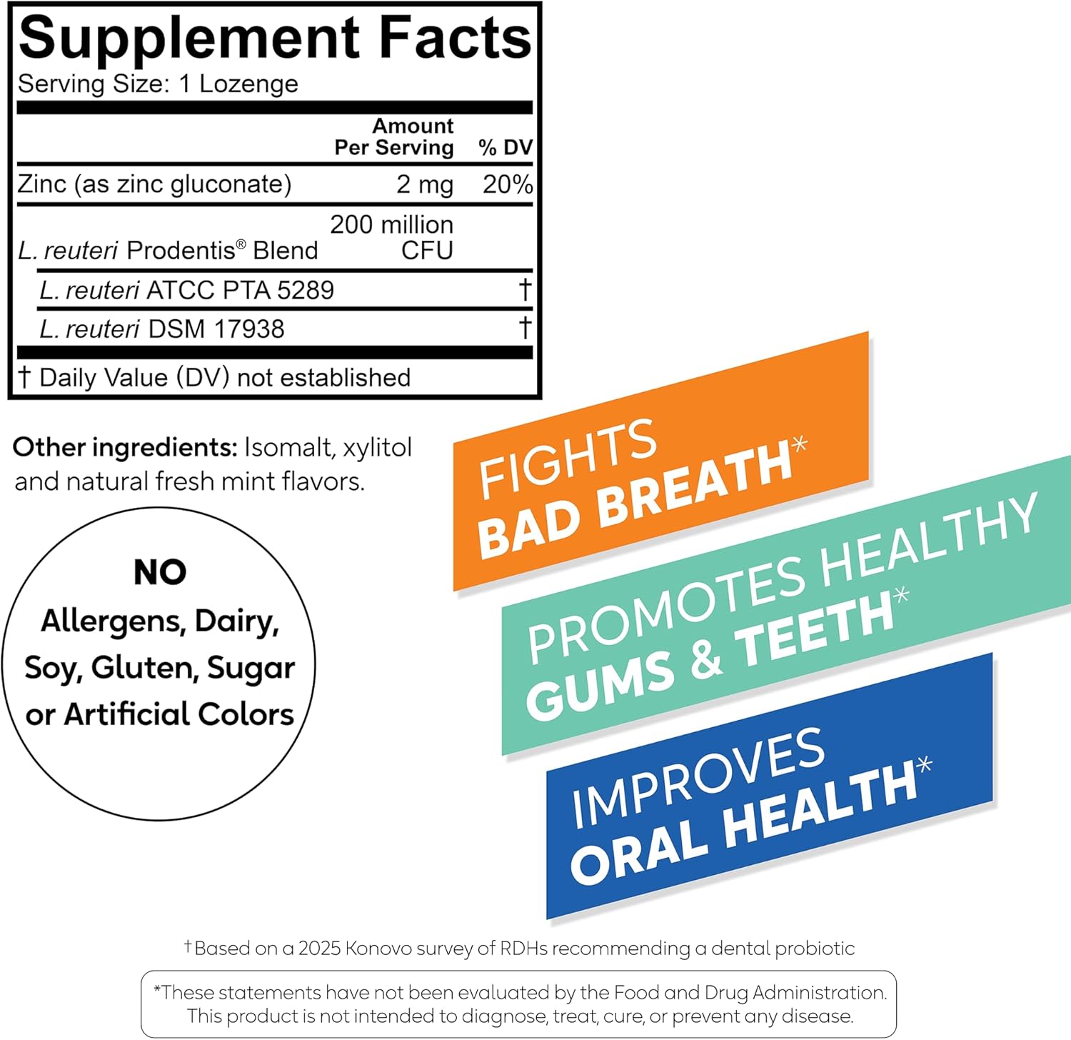| Special Ingredients | L. reuteri Prodentis Blend (L. reuteri ATCC PTA 5289 and L. reuteri DSM 17938), Zinc (as zinc gluconate) |