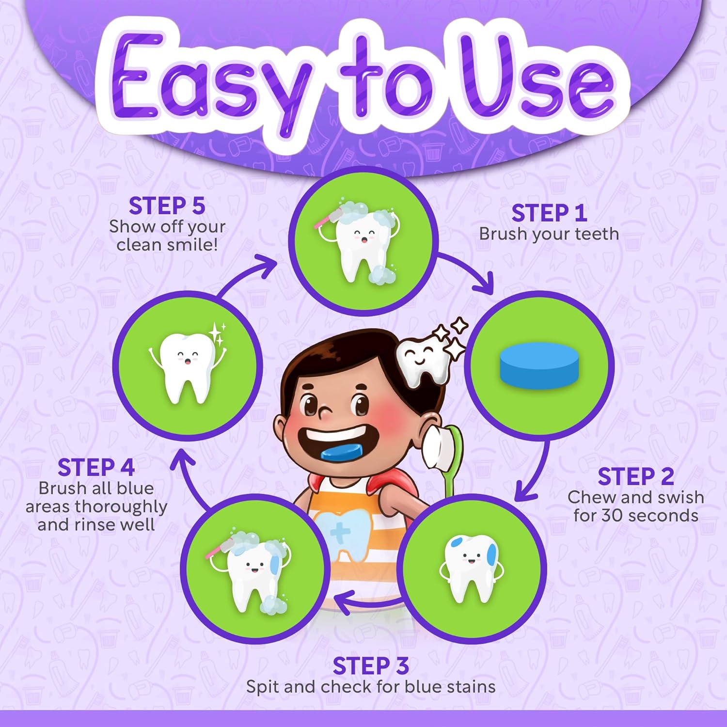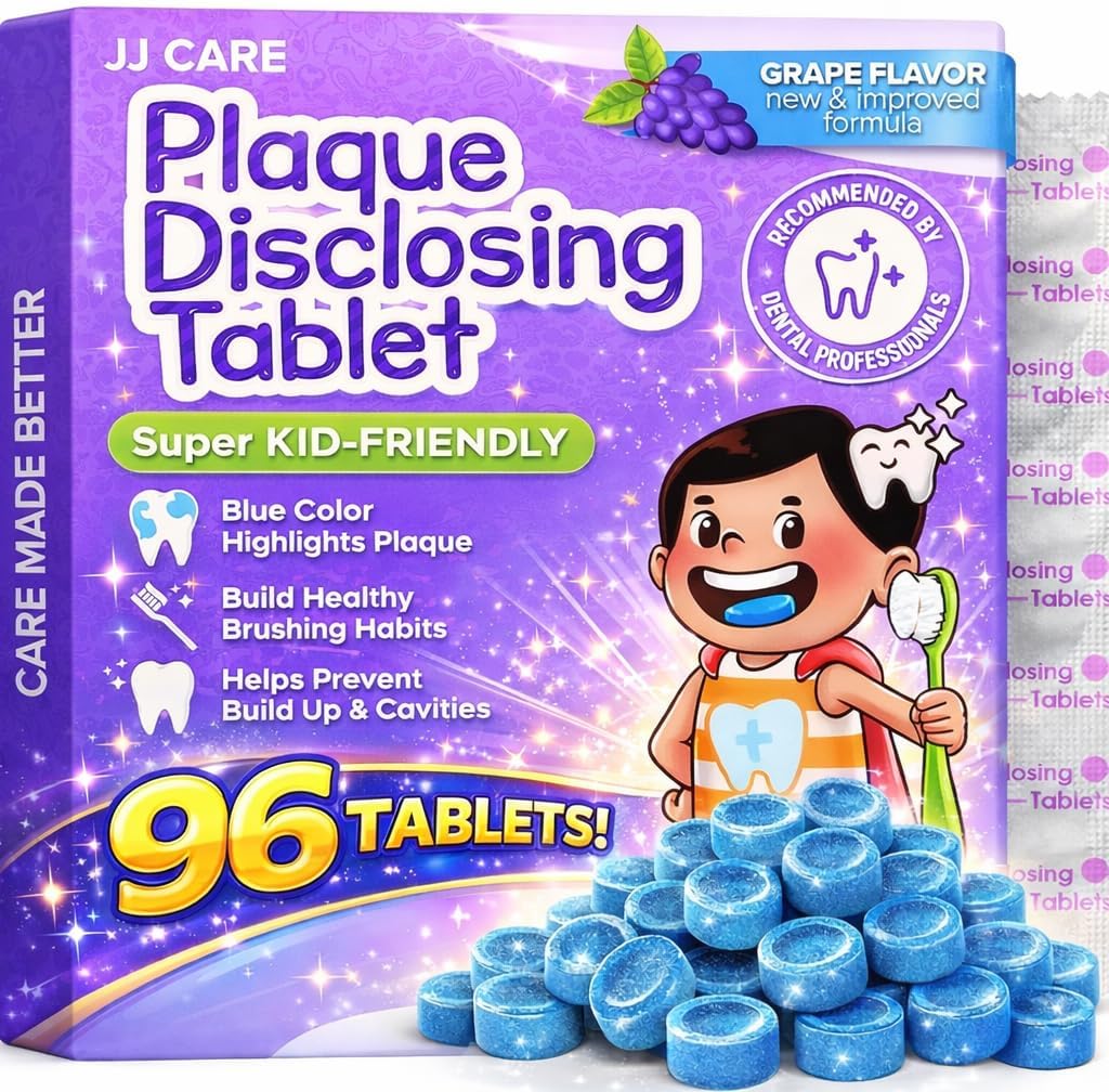 The JJ CARE disclosing tablet is a dental hygiene product that is used to detect dental plaque on teeth. Plaque is a white, sticky film that forms on teeth and contains bacteria. If not eliminated on a regular basis by basic dental hygiene techniques such as brushing and flossing, it can lead to tooth decay and gum disease. Our disclosing tablet is made of nontoxic, water-soluble pigment that temporarily tints plaque on teeth. The dye binds to the plaque when chewed or dissolved in the mouth and swished about, making it visible and emphasizing places that may have been overlooked during normal brushing. It has the ability to increase awareness of the importance of thorough brushing while also inspiring better dental care practices.