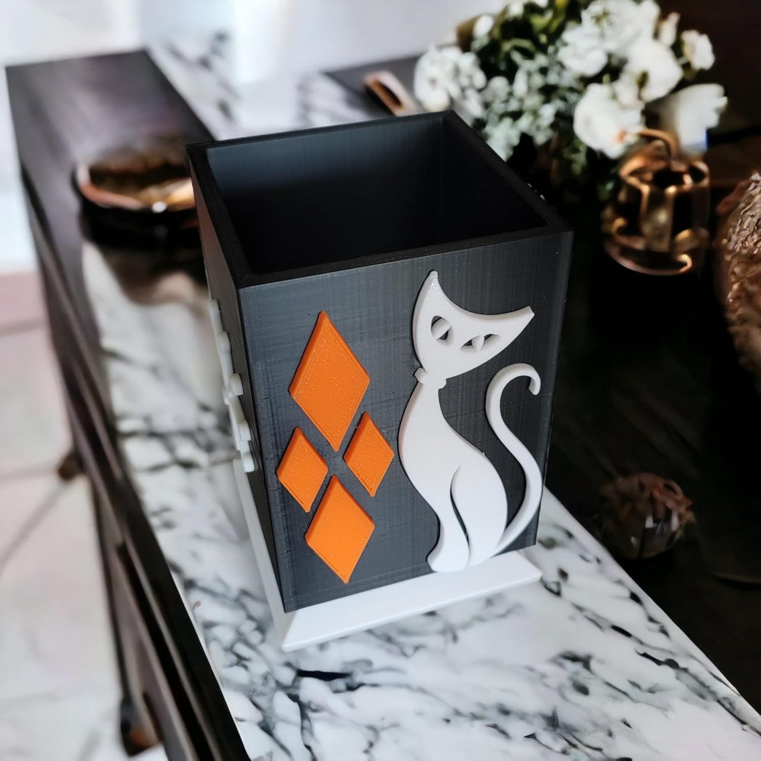 Introduce a pop of vintage charm to your workspace with our Midcentury Modern Atomic Cat Desk Organizer. Say farewell to cluttered drawers and hello to a beautifully crafted, eco-friendly piece of art that keeps your pens, pencils, makeup brushes or paint brushes in check.Made from 3d printed thermoplastic materal our Pencil/Brush Holder is not only functional, but looks amazing on any desk. Available in a two different retro hues, it's sure to complement any decor style, from mid-century modern to farmhouse.Not just for desk use, these retro-inspired organizers are also perfect for decluttering kitchen counters, nightstands and vanity stations. Its lightweight yet durable design makes it easy to carry and use anywhere in your home or office. And with its high infill and tensile strength, it's built to last. Upgrade your workspace and elevate your organizational game with our Midcentury Modern Atomic Cat Desk Organizer today.Size 3.5" wide x 3.5 deep" x 5" tallAll our products are made to order, please allow us time to do so. Sometimes this can take 5-7 days depending on the order volume. Every product we carry comes with our 100% satisfaction guarantee. If you don't like it just send it back to us for a full refund!Please note - 3D printed objects are by no means perfect. There could be some small layer lines and minor defects that may be visible but does not affect the function or durability of our products.