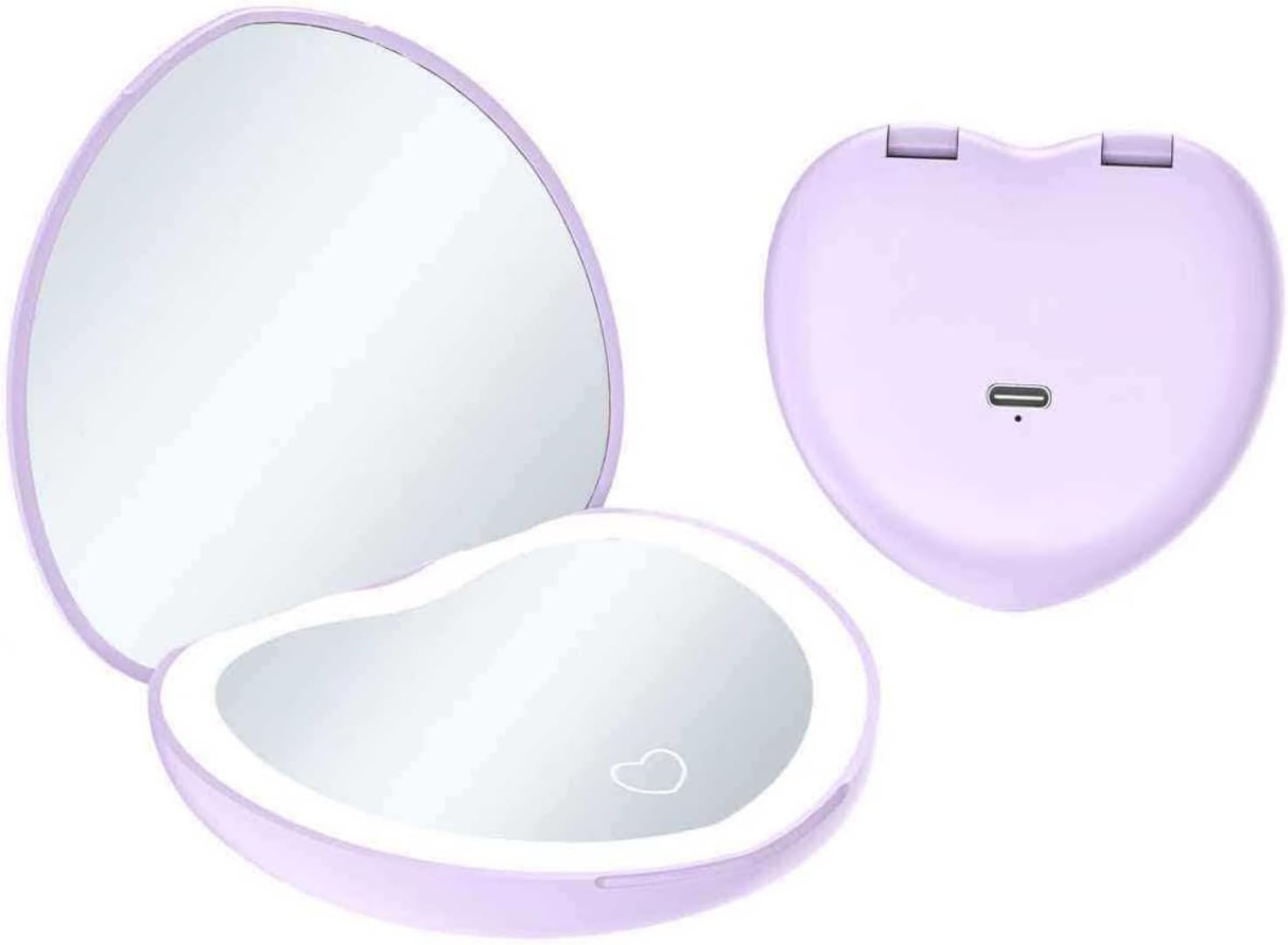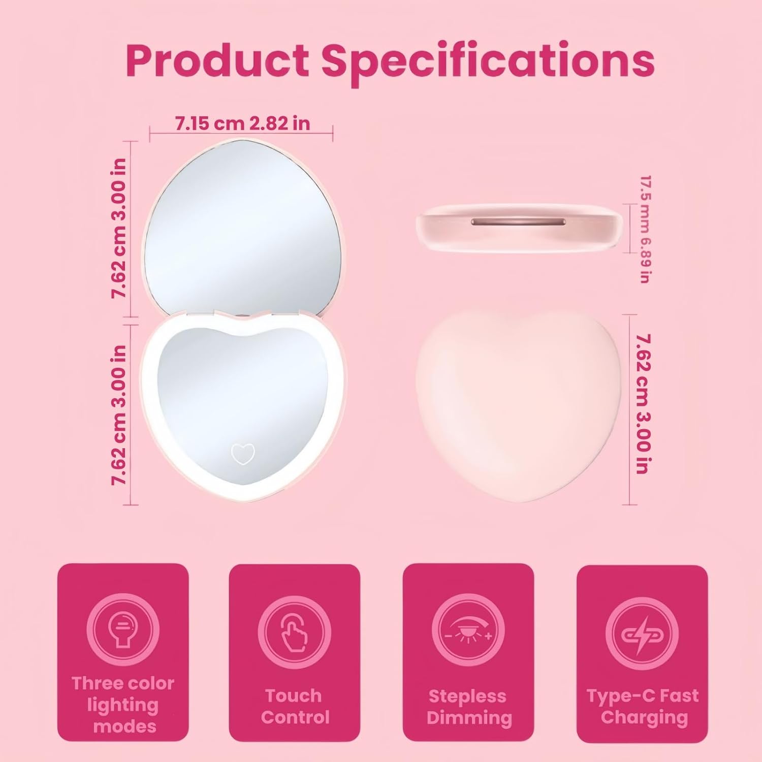 Perfect Lighting. Perfect Makeup. Anywhere.This LED lighted travel makeup mirror is designed for beauty on the go. Compact yet powerful, it combines smart lighting, dual magnification, and a sleek heart-shaped design to meet all your daily makeup and skincare needs. Key Features:1X & 2X Magnification: One side offers a true HD reflection, while the 2X magnifying mirror helps with detailed makeup, skincare, and grooming.3 Color LED Lighting: Choose from cool light, warm light, or natural light to match different environments and times of day.Stepless Dimming: Adjust brightness smoothly with a simple touch for the perfect lighting every time.Type-C Fast Charging: Recharge quickly and conveniently with the included USB Type-C cable. No batteries required.Magnetic Auto-Off Design: Smart magnetic switch turns the mirror off automatically when closed, saving energy. Compact & Travel-FriendlyMeasuring just 3.00" × 2.82" × 0.69" and weighing only 0.14 lb, this folding mirror fits easily into your purse, pocket, or handbag—perfect for travel, work, or daily touch-ups. What’s Included:LED Portable Heart-Shaped Makeup Mirror × 1USB Type-C Charging Cable × 1User Manual × 1 This stylish illuminated mirror makes a wonderful gift for mothers, girlfriends, makeup lovers, and anyone who values beauty and convenience.