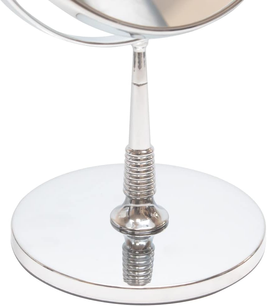 The Calabria 8031 Magnifying Mirror combines elegance with functionality, ideal for anyone looking to enhance their grooming and beauty routine. This round, double-sided mirror provides both 1x and 5x magnification, ideal for everything from a general overview to detailed grooming tasks. The versatile 360-degree rotation feature allows easy switching between magnifications, ensuring you can find the ideal angle for every need.The mirror boasts a stylish vintage design, complete with a polished chrome finish that not only adds a layer of sophistication to any room but also provides a durable, tarnish-resistant surface. This makes it not just a functional tool for daily use but also a decorative addition to any vanity or bathroom countertop.With a 6.5-inch diameter, this mirror provides a sufficient viewing area while maintaining a compact design, making it suitable for various spaces, whether large or small. It is specifically designed for tabletop mounting, ensuring it can be easily placed on any flat surface, from a bathroom sink to a beauty salon’s styling station.This magnifying mirror is thoughtfully designed to blend functionality with aesthetic appeal. Its dimensions, including a mirror diameter of 165 mm (6.5 inches) and an overall height of 267 mm (10.5 inches) including the stand, makes it an ideal choice for stationary use.The Calabria 8031 is an essential tool for anyone seeking a reliable, beautiful mirror that can support a wide range of beauty and grooming tasks.
