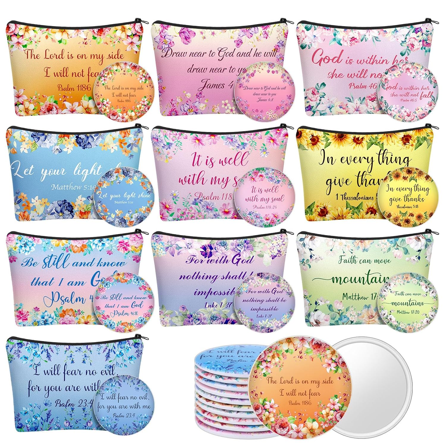 Features: Thoughtful Gift: Each piece in this set serves as a meaningful and practical gift, ideal for birthdays, Christmas, graduations, or simply to show appreciation. The positive affirmations brightens someone's day. Black Feminine Theme: This women's cosmetic bag is printed with carefully designed black feminine theme patterns. Mirror printed with inspirational words. These printed patterns show an optimistic and positive attitude towards life and women's strong willpower and hope for the future. Specifications: Material: Makeup bags: canvas Color: multi color Size: Black African Women Makeup Bag: 9" x 5.3" x 1.6" Package includes: 10 x Black African Women Canvas makeup bags 10 x Mirrors Notes: Manual measurement, please allow slight errors on size. The color may exist a slight difference due to different screen displays.