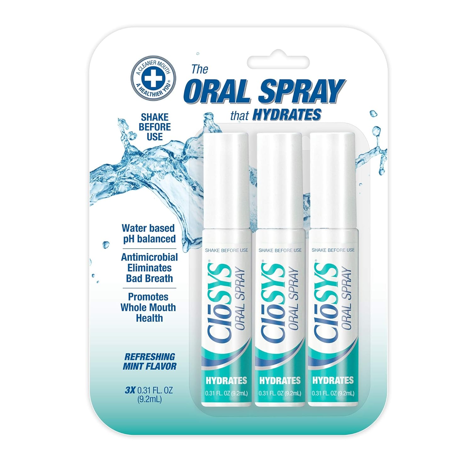 The CloSYS bundle includes a 32 ounce bottle of ultra sensitive unflavored mouthwash and a pack of 3 mint-flavored oral breath sprays. The gentle, pH balanced formulas work together to promote oral health and long-lasting fresh breath without irritation. The unflavored mouthwash is as gentle as water, cleaning and soothing the entire mouth while killing bad breath germs. It can be used safely twice a day by all ages. The optional mint flavor dropper allows you to add refreshing flavor as desired. The portable oral sprays provide an extra burst of freshness when brushing isn't possible. The minty pH balanced spray hydrates gums and eliminates odor causing bacteria for cleaner breath on-the-go. At 0.31 ounces, the spray bottles fit perfectly in a pocket or bag. With the large mouthwash for at-home use and the pack of sprays for freshness anywhere, this alcohol-free, dye-free CloSYS bundle offers a gentle way to maintain good oral health and fresh breath throughout your busy day.