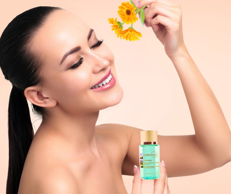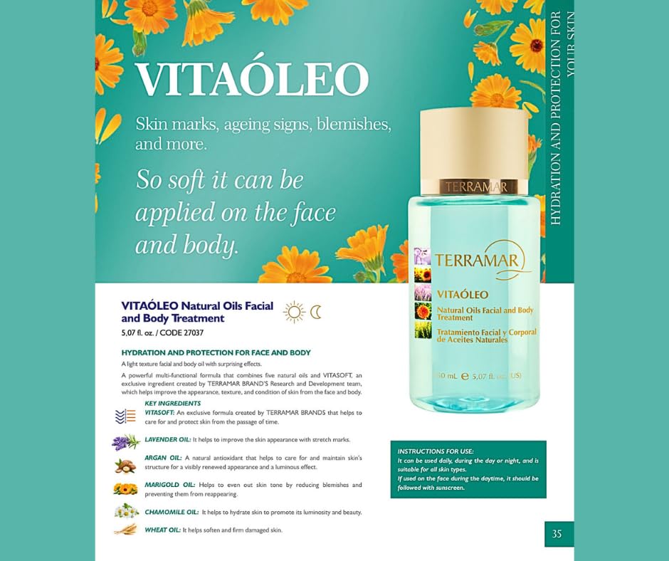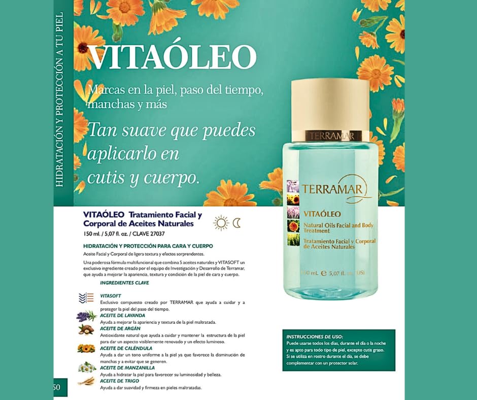 HIDRATACIÓN Y PROTECCIÓN PARA CARA Y CUERPO Aceite Facial y Corporal de ligera textura y efectos sorprendentes. Una poderosa fórmula multifuncional que combina 5 aceites naturales y VITASOFT un exclusivo ingrediente creado por el equipo de Investigación y Desarrollo de Terramar, que ayuda a mejorar la apariencia, textura y condición de la piel de cara y cuerpo. INGREDIENTES CLAVE VITASOFT Exclusivo compuesto creado por TERRAMAR que ayuda a cuidar y a proteger la piel del paso del tiempo. ACEITE DE LAVANDA Ayuda a mejorar la apariencia y textura de la piel maltratada. ACEITE DE ARGÁN Antioxidante natural que ayuda a cuidar y mantener la estructura de la piel para dar un aspecto visiblemente renovado y un efecto luminoso. ACEITE DE CALÉNDULA Ayuda a dar un tono uniforme a la piel ya que favorece la disminución de manchas y a evitar que se generen. ACEITE DE MANZANILLA Ayuda a hidratar la piel para favorecer su luminosidad y belleza. ACEITE DE TRIGO Ayuda a dar suavidad y firmeza en pieles maltratadas. INSTRUCCIONES DE USO: Puede usarse todos los días, durante el día o la noche y es apto para todo tipo de piel, excepto cutis graso. Si se utiliza en rostro durante el día, se debe complementar con un protector solar.