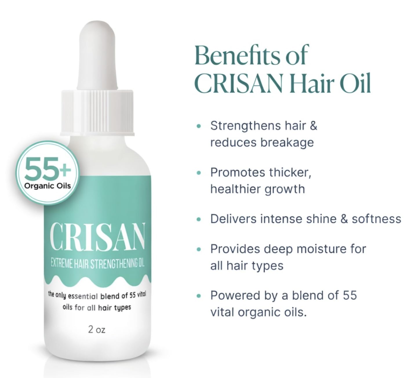| Product Benefits | strengthens hair to reduce breakage; helps repair damaged strands; adds intense shine for healthier-looking hair; deeply nourishes and hydrates dry hair; improves softness and smoothness; supports thicker-looking hair over time; helps reduce split ends and frizz; promotes a healthy scalp environment; enhances hair manageability and detangling; boosts natural vibrancy and color appearance; lightweight formula absorbs quickly without greasiness; works as a leave-in conditioner, pre-shampoo treatment, or overnight mask; suitable for all hair types including straight, wavy, curly, and coily; ideal for fine, thick, color-treated, or chemically processed hair; made with 55 organic vegan oils from around the world; clean, non-toxic, and cruelty-free formula; convenient 2 oz travel size for on-the-go hair care; helps restore strength to dull and weakened hair; supports overall hair resilience and elasticity; provides multi-purpose deep conditioning in one bottle |