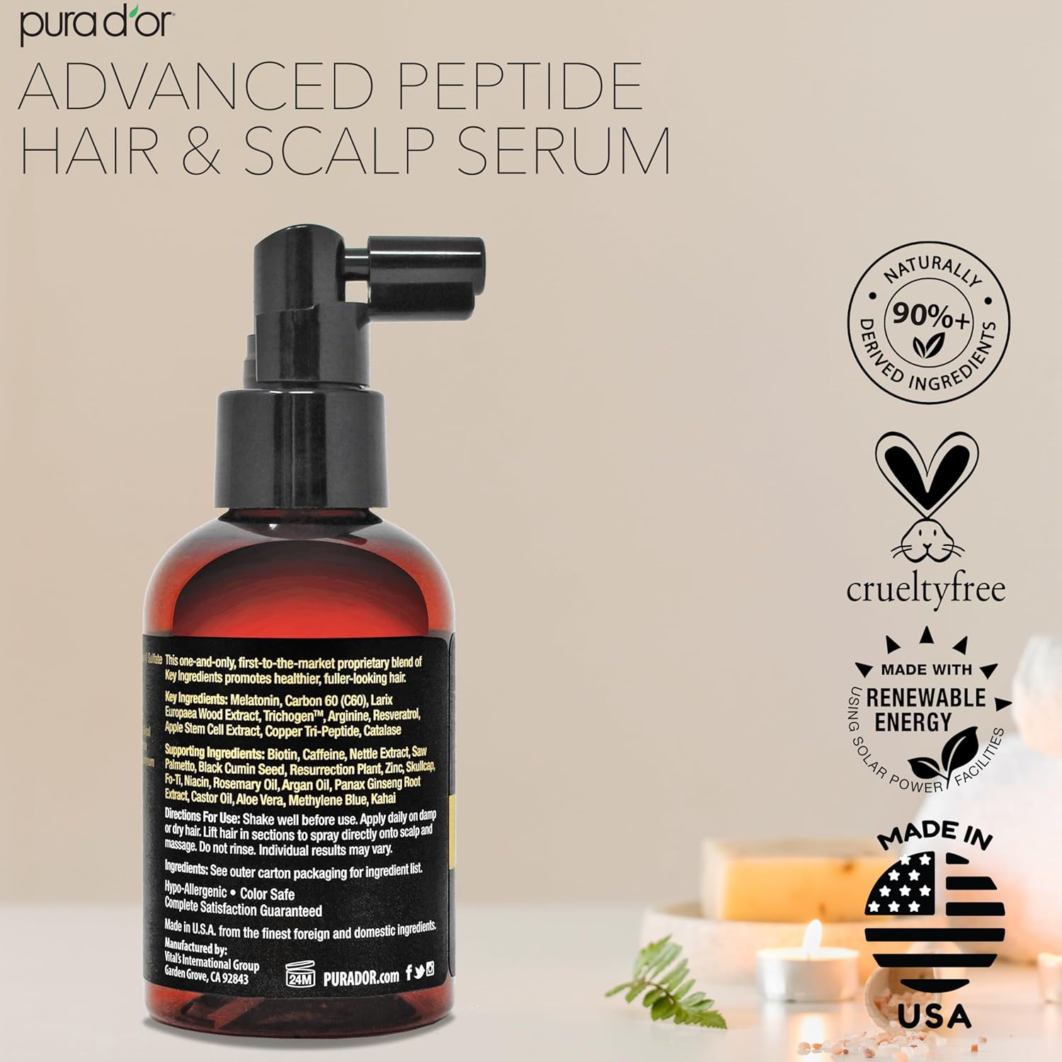 PURA D’OR Advanced Hair & Scalp Serum is a refined, lightweight leave-in treatment crafted to enhance the appearance of fuller, healthier-looking hair and a balanced, revitalized scalp. This sophisticated formula blends Copper Tri-Peptide-1, caffeine, plant-based peptides, fermented ingredients, antioxidants, enzymes, amino acids, vitamins, botanical oils, and phytonutrients to help improve the look of density, volume, and overall strand vitality while minimizing the appearance of thinning, dullness, limpness, and breakage. Designed to condition and refresh without heaviness, the serum supports scalp comfort, hydration, and balance for a polished, weightless finish. Made with 90% naturally derived ingredients, this vegan, cruelty-free, color-safe formula is free from sulfates, parabens, gluten, and harsh chemicals, making it suitable for daily use by men and women seeking elevated, science-driven haircare.