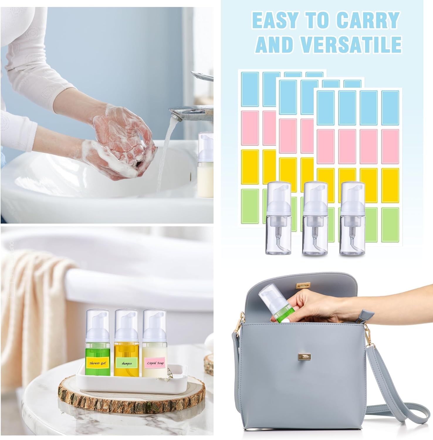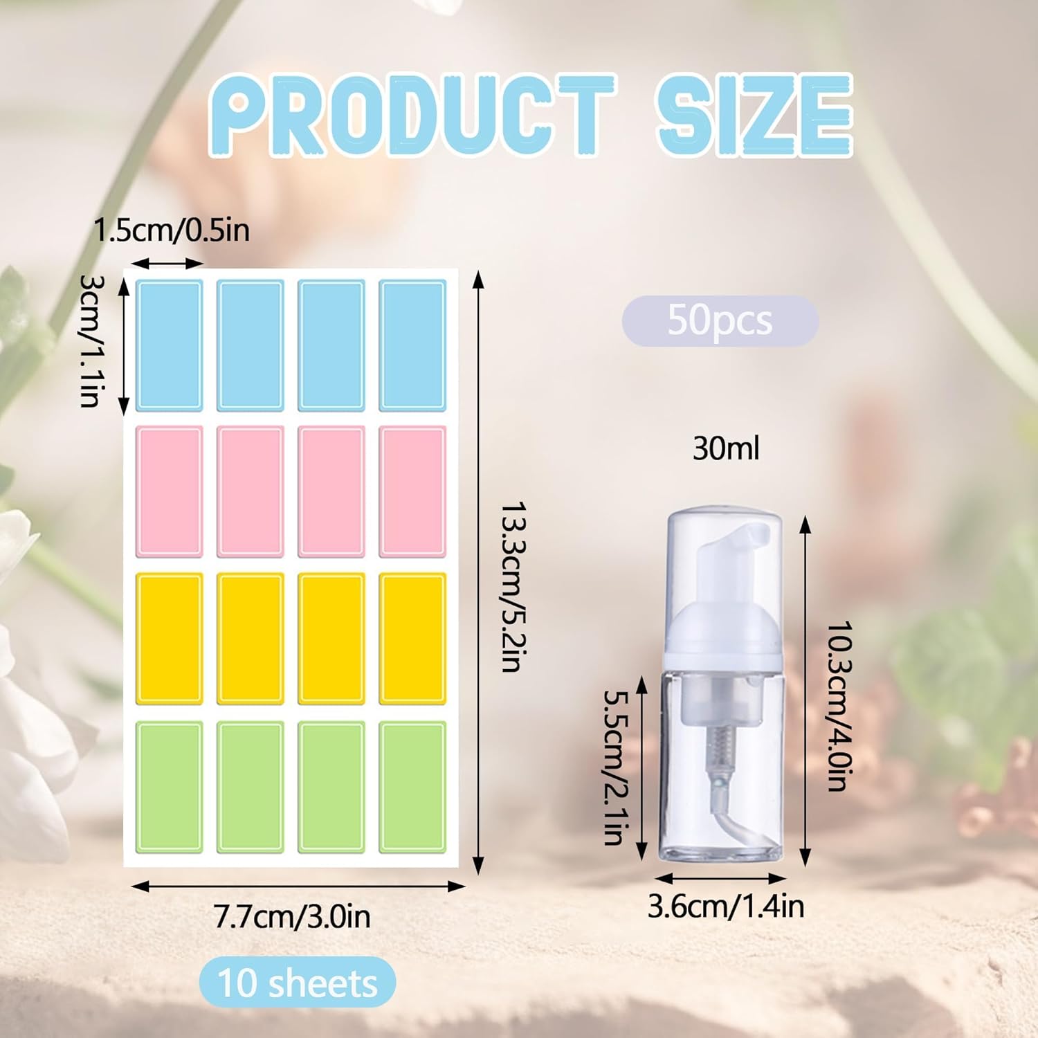 "Features:[The compact size of these travel size pump bottles makes them easy to carry in your purse,beauty bag,or travel bag]Specifications:Material:[PET plastic]Color:[transparent]Size: [30 ml/1 oz]Package includes:[50 pcs foam pump bottle + 160 colorful labels]Notes:Manual measurement, please allow slight errors on sizeThe color may exist a slight difference due to different screen displays"