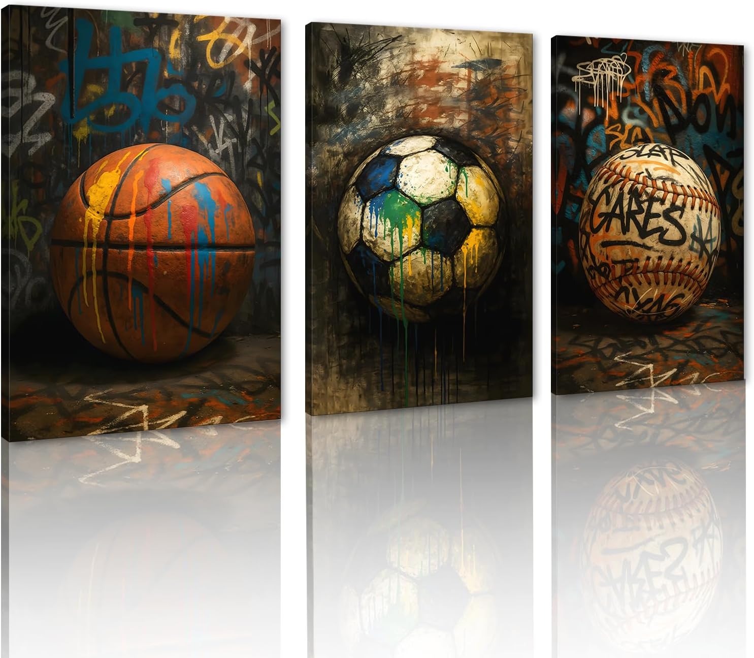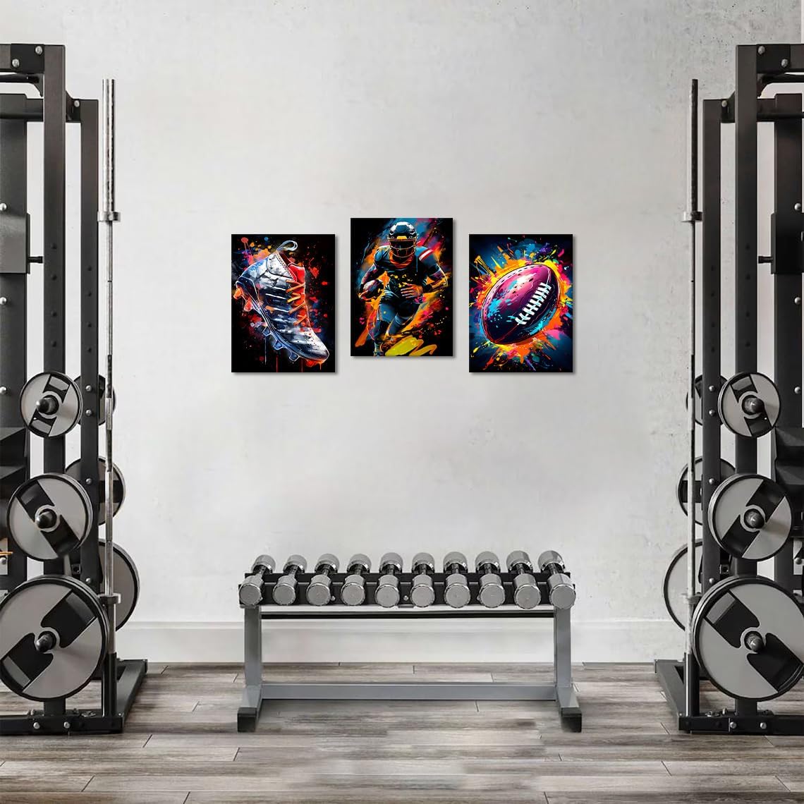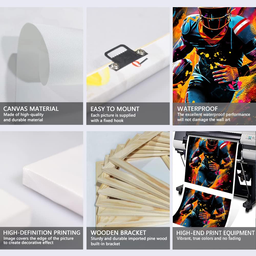 Yatsen Bridge 3-Piece Graffiti-Style Sports Theme Wall Art Set - American Football Player, Football, and Sports Shoes Canvas Prints for Home Decor Panels: - American Football Player: Captures the action and excitement of American football with dynamic colors and movement. - Football: A stylized representation of a football, symbolizing teamwork and competition, enhanced by bold graffiti elements. - Sneakers: Showcases a pair of fashionable sneakers, reflecting athleticism and modern style, appealing to sneaker enthusiasts. Specifications: Quantity: 3 Panels Material: Canvas Available in 3 sizes: 12x16inchx3pcs, 20x28inchx3pcs, 24x36inchx3pcs Frame: Wooden frame Printing Technology: High-Resolution Giclee Printing Hanging Hardware: Pre-installed Hooks Product Features: - Durable Construction: The canvas is stretched over a sturdy wooden frame, ensuring that the artwork remains in excellent condition over time. - Versatile Display: Perfect for bedrooms, game rooms, living areas, or offices, this wall art set enhances any space, making it a great addition to sports-themed decor. - Easy to Maintain: Wipe with a soft, dry cloth to remove dust Perfect Gift Choice An excellent gift for birthdays, holidays, or special occasions, ideal for sports fans, athletes, or anyone who appreciates modern, artistic decor. Packing: Framed Sports Wall Art Set of 3 Satisfaction Guarantee: If you are not satisfied with the product or service, please contact us in time, we are here to serve you. Warm Attention: 1. Please measure the wall accurately and make sure to choose the right size. 2. There is no difference in the product itself, but due to different brands of monitors, actual wall art colors may be slightly different from the product image.