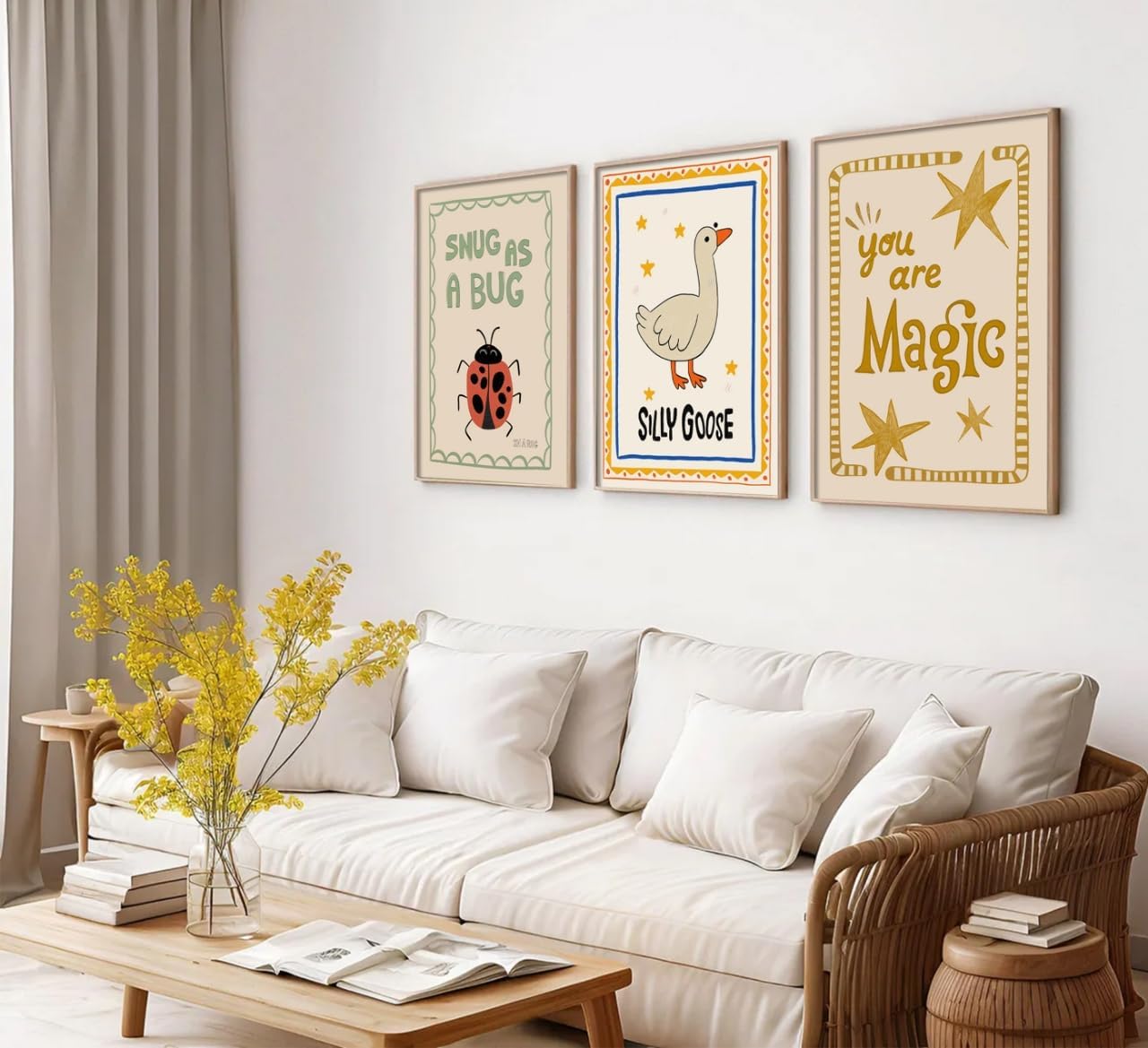 This set of posters consists of three prints: "Silly Goose," "Snug as a Bug," and "You Are Magic," each with its own unique character and mood. One is silly, one is cozy, and one is full of wonder. Whimsical, playful, and perfectly balanced, this trio will brighten any space