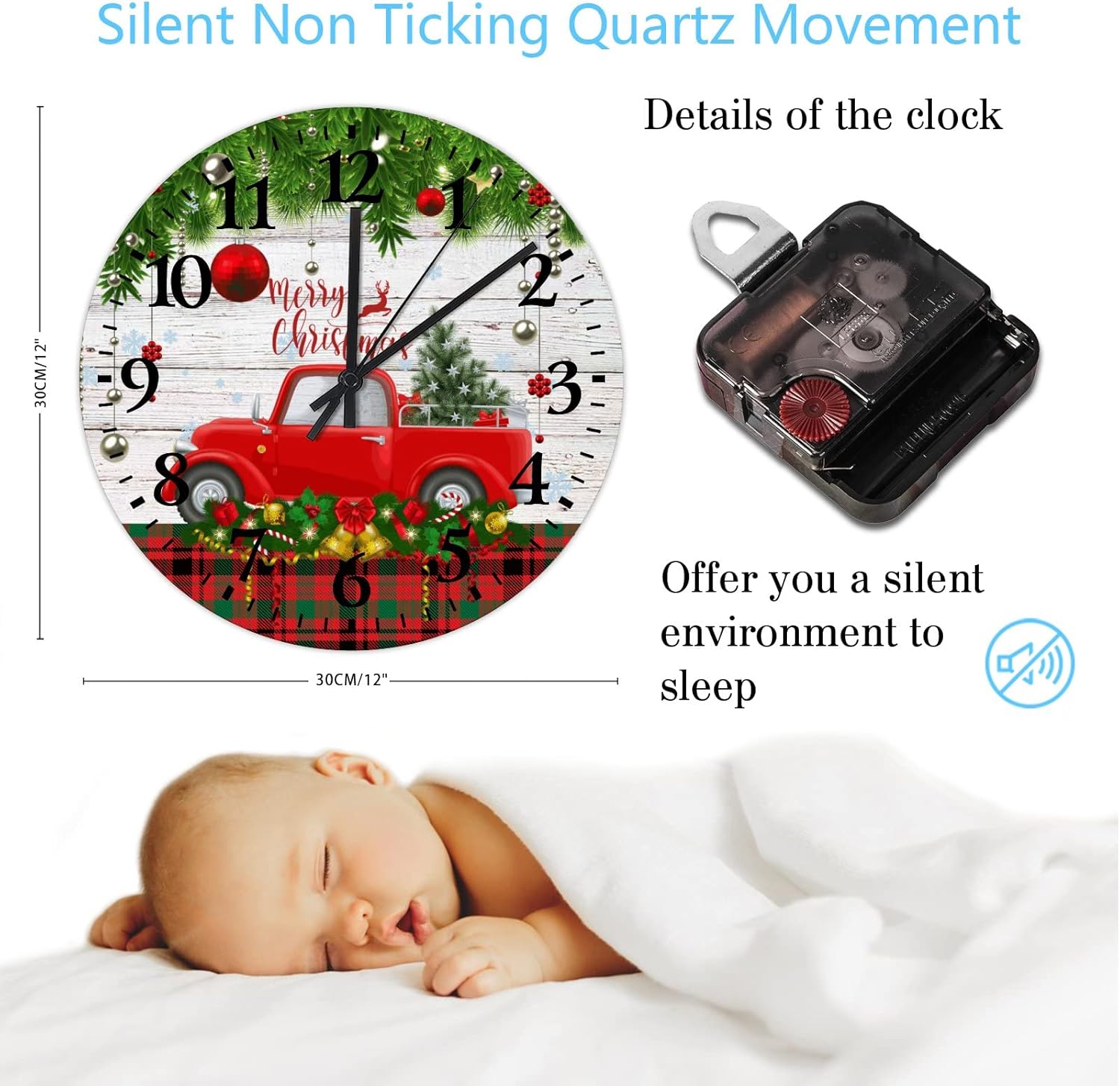 Merry Christmas Tree Truck Wooden Wall Clock Christmas Decor Red Truck with Tree Merry Christmas farmhouse clock Battery Operated Quartz Analog Quiet Arabic Numbers Clock Kids Room and Kitchen 12 Inch??Details:Product Size: 10/12/15 inches, (25/30/38 cm)Shape:RoundMaterial: Wood??Functional Home DécorThis Red Truck & Christmas Tree clock aren't just for timekeeping. They function as beautiful wall decor pieces, beyond telling time, and bring both style and purpose to any room.A charming home decoration, very suitable as a housewarming gift, making the home more warm. Suitable for any room, you can put it in any room such as home, living room, master bedroom, kitchen, bathroom, home office, etc. Elegant, durable and stylish.??Clock Hands Troubleshooting Guide:Check that the battery is a new battery and not a used battery.Make sure the hour and minute hands are not crossing or touching each other. If they are, adjust the hands by slightly bending them.See if the center pin that holds the hands together is firmly pushed in or screwed on, depending on the style.If hands are still not moving after the above, please reference the hands replacement instructions included with all of our open face clocks.