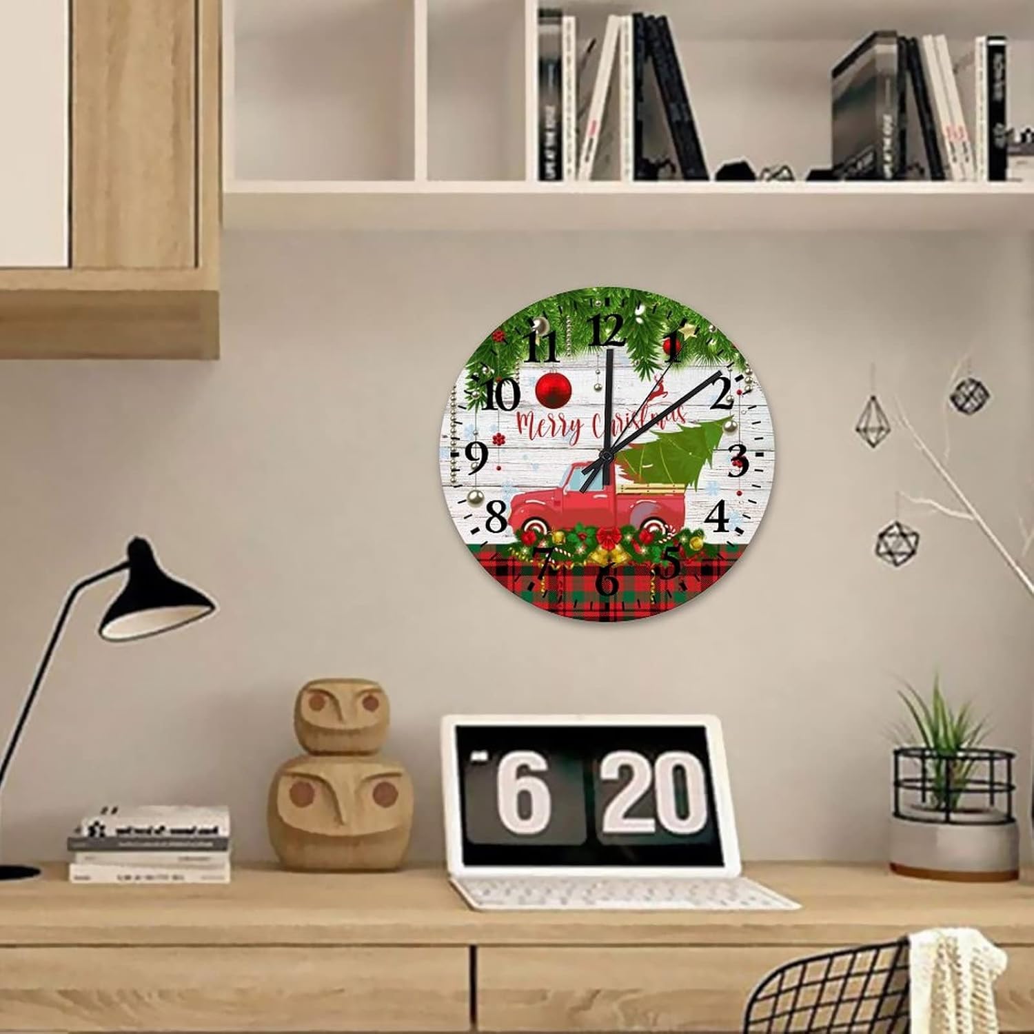 Merry Christmas Tree Truck Wall Clock Farmhouse Christmas Tree in Red Car Room Decorative Wall Clock Quartz Non Ticking Arabic Numeral Clock Dining Room Decor 12 Inch??Details:Product Size: 10/12/15 inches, (25/30/38 cm)Shape:RoundMaterial: Wood??Functional Home DécorThis Red Truck and Trees clock aren't just for timekeeping. They function as beautiful wall decor pieces, beyond telling time, and bring both style and purpose to any room.A charming home decoration, very suitable as a housewarming gift, making the home more warm. Suitable for any room, you can put it in any room such as home, living room, master bedroom, kitchen, bathroom, home office, etc. Elegant, durable and stylish.??Clock Hands Troubleshooting Guide:Check that the battery is a new battery and not a used battery.Make sure the hour and minute hands are not crossing or touching each other. If they are, adjust the hands by slightly bending them.See if the center pin that holds the hands together is firmly pushed in or screwed on, depending on the style.If hands are still not moving after the above, please reference the hands replacement instructions included with all of our open face clocks.