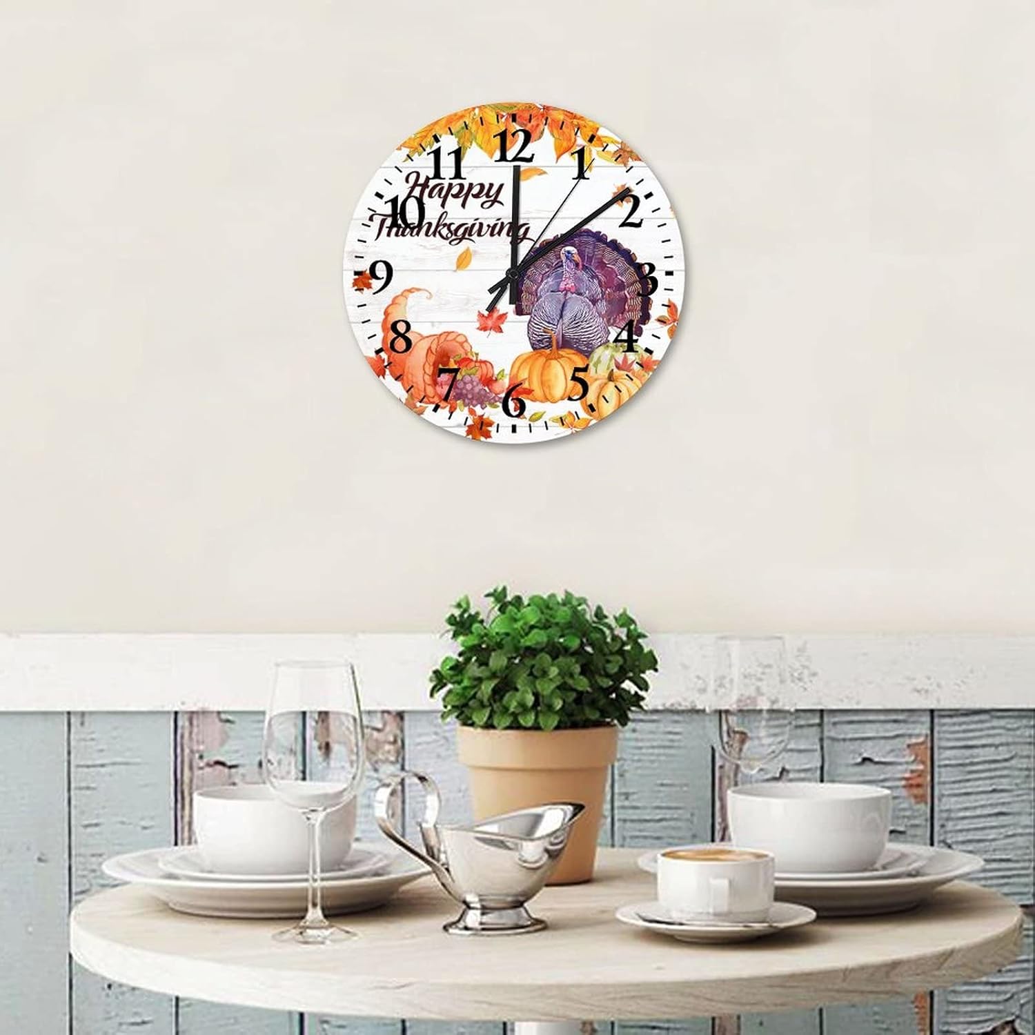 Happy Thanksgiving Day Funny Turkey with Pumpkins Maple Leaves wooden clocks Autumn Harvest Thanksgiving Retro Wood Wall Clock Battery Operated Silent Noiseless Round Arabic Numeral Clock Living Room Bedroom Office Kitchen School 12x12 in??Details:Product Size: 10/12/15 inches, (25/30/38 cm)Shape:RoundMaterial: Wood??Functional Home DécorThis Seasonal Autumn Harvest Vintage Thanksgiving clock aren't just for timekeeping. They function as beautiful wall decor pieces, beyond telling time, and bring both style and purpose to any room.A charming home decoration, very suitable as a housewarming gift, making the home more warm. Suitable for any room, you can put it in any room such as home, living room, master bedroom, kitchen, bathroom, home office, etc. Elegant, durable and stylish.??Clock Hands Troubleshooting Guide:Check that the battery is a new battery and not a used battery.Make sure the hour and minute hands are not crossing or touching each other. If they are, adjust the hands by slightly bending them.See if the center pin that holds the hands together is firmly pushed in or screwed on, depending on the style.If hands are still not moving after the above, please reference the hands replacement instructions included with all of our open face clocks.