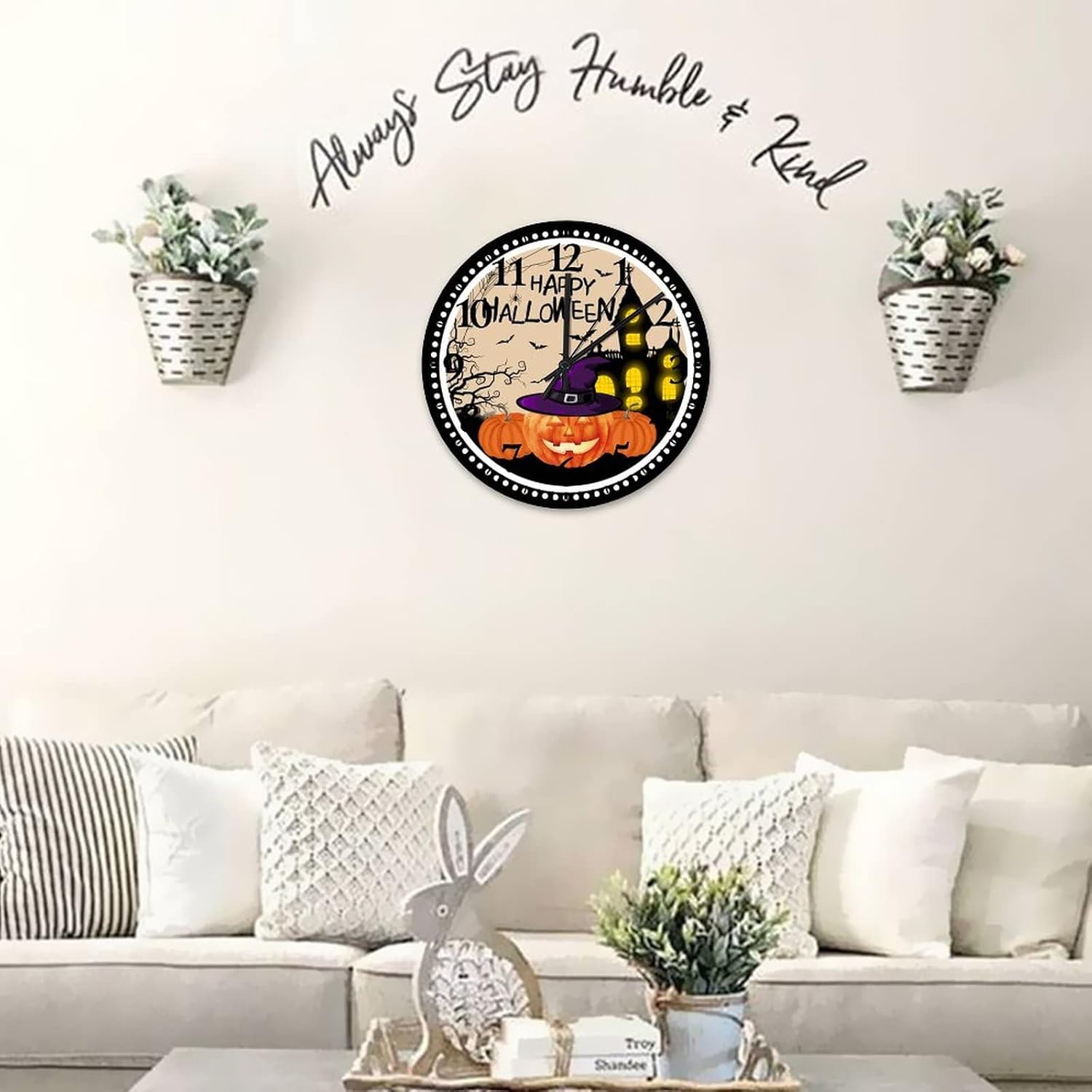 Happy Halloween Pumpkin Hunted House Clocks halloween Jack-o'-Lantern Pumkin clocks for living room decor Battery Operated Arabic Numbers Clock Kids Room and Kitchen 12 Inch??Details:Product Size: 10/12/15 inches, (25/30/38 cm)Shape:RoundMaterial: Wood??Functional Home DécorThis Jack O'Lantern Pumpkin with Witch Hat clock aren't just for timekeeping. They function as beautiful wall decor pieces, beyond telling time, and bring both style and purpose to any room.A charming home decoration, very suitable as a housewarming gift, making the home more warm. Suitable for any room, you can put it in any room such as home, living room, master bedroom, kitchen, bathroom, home office, etc. Elegant, durable and stylish.??Clock Hands Troubleshooting Guide:Check that the battery is a new battery and not a used battery.Make sure the hour and minute hands are not crossing or touching each other. If they are, adjust the hands by slightly bending them.See if the center pin that holds the hands together is firmly pushed in or screwed on, depending on the style.If hands are still not moving after the above, please reference the hands replacement instructions included with all of our open face clocks.