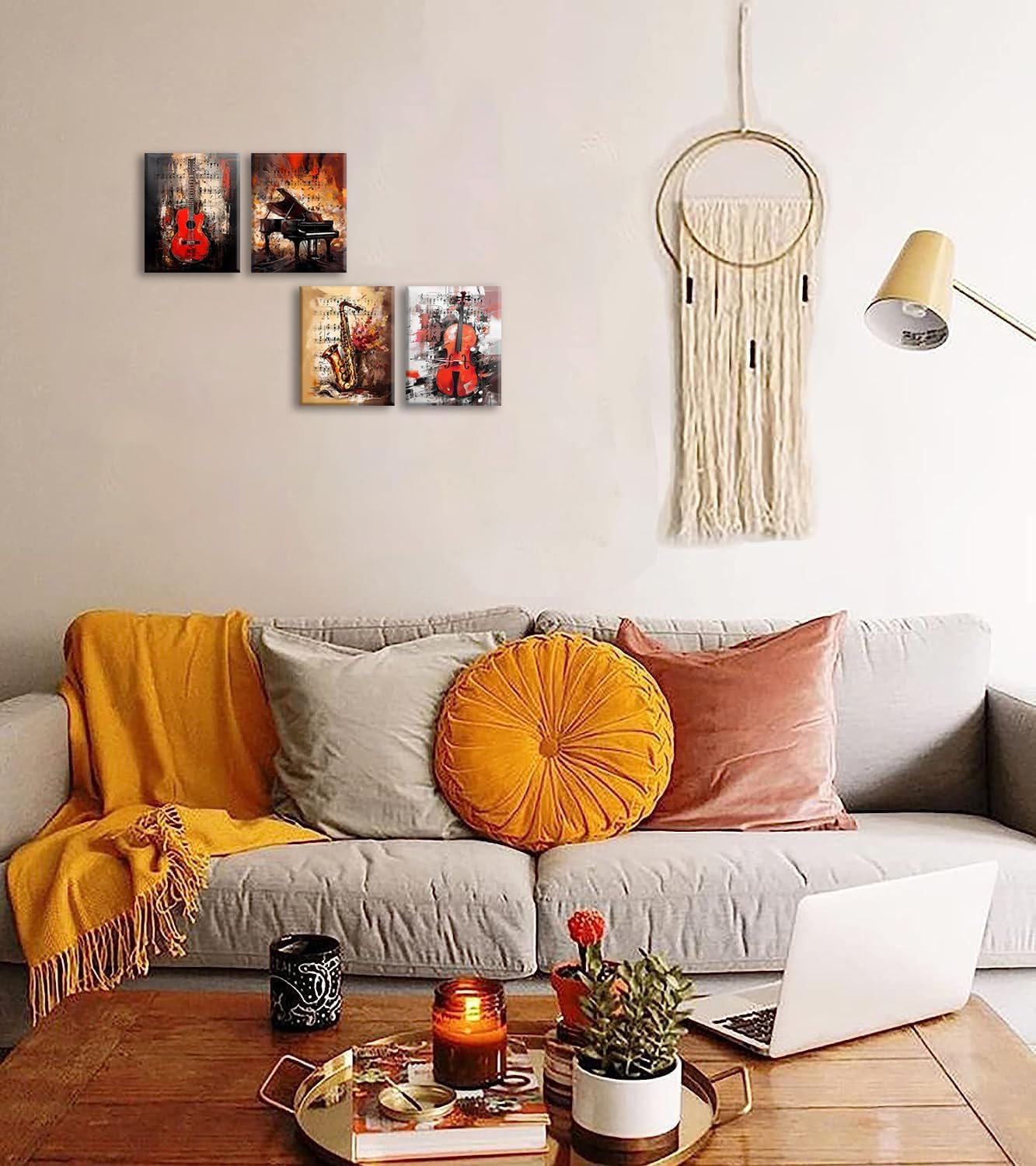 Immerse yourself in the captivating world of music with this set of four framed canvas wall art pieces. Each artwork beautifully captures the essence of iconic musical instruments, including a guitar, piano, saxophone, and violin, blending them with abstract elements and musical notes. The vibrant colors and intricate details create a mesmerizing visual experience, perfect for adding a touch of artistic flair to your living space or music room. Measuring 8 x 10 inches each, these canvases can be arranged in a striking gallery-style display or individually showcased to suit your personal taste. Elevate your decor with this vintage-inspired music-themed wall art set that celebrates the timeless allure of music.