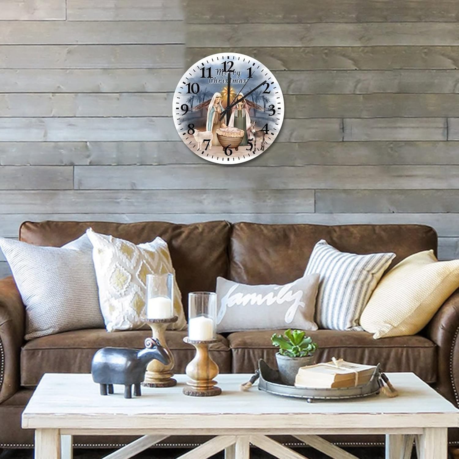 Birth of Jesus Wood Clock Christmas Nativity Decor modern clock Silent Non-Ticking Battery Operated Arabic Numeral Clock Living Room Office 12 Inch??Details:Product Size: 10/12/15 inches, (25/30/38 cm)Shape:RoundMaterial: Wood??Functional Home DécorThis Religious Christian Nativity Scene clock aren't just for timekeeping. They function as beautiful wall decor pieces, beyond telling time, and bring both style and purpose to any room.A charming home decoration, very suitable as a housewarming gift, making the home more warm. Suitable for any room, you can put it in any room such as home, living room, master bedroom, kitchen, bathroom, home office, etc. Elegant, durable and stylish.??Clock Hands Troubleshooting Guide:Check that the battery is a new battery and not a used battery.Make sure the hour and minute hands are not crossing or touching each other. If they are, adjust the hands by slightly bending them.See if the center pin that holds the hands together is firmly pushed in or screwed on, depending on the style.If hands are still not moving after the above, please reference the hands replacement instructions included with all of our open face clocks.