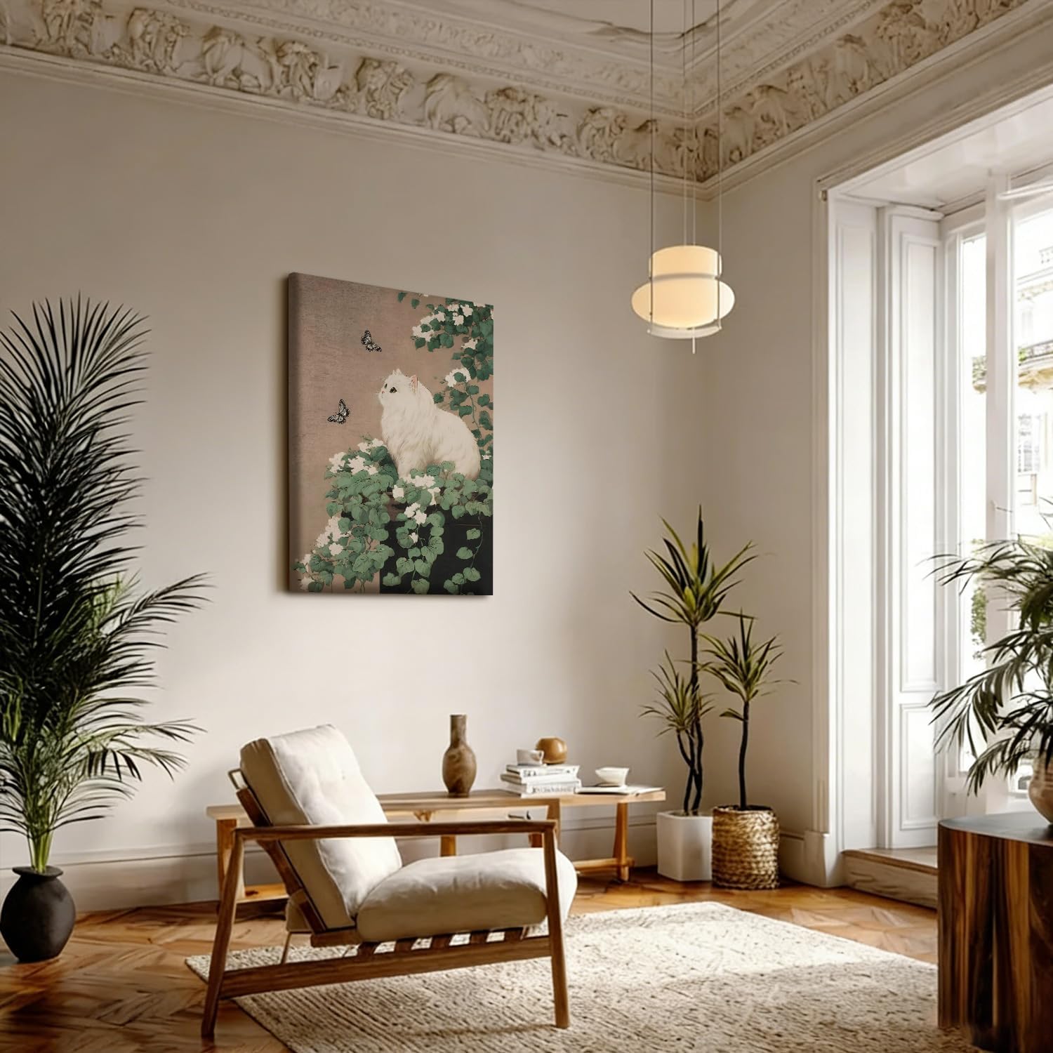"Elevate your home with the HCJWCXD Japanese Style White Cat & Butterfly Canvas Wall Art—a 16x24-inch framed print that merges classic aesthetics with gentle pet charm, creating a serene focal point for any living space. This artwork captures a tranquil moment: a fluffy white cat sits among lush green gardenia vines, its eyes fixed on two delicate butterflies fluttering nearby. The warm beige backdrop and soft, muted tones evoke the calm elegance of traditional Japanese art, blending seamlessly with modern, boho, and vintage decor styles to bring a sense of peace and nostalgia to your home. Crafted for lasting beauty, the piece uses high-definition printing on premium canvas to preserve every fine detail—from the cat’s soft fur to the delicate veins of the gardenia leaves and the intricate patterns of the butterfly wings. The canvas is wrapped tightly over solid wooden frames, ensuring structural stability and a polished, gallery-worthy finish. Pre-installed hooks eliminate the need for tools, letting you hang the artwork in minutes to instantly transform your walls. More than just decor, this Japanese-style canvas print is a thoughtful gift for cat lovers, art enthusiasts, and anyone who appreciates serene, nature-inspired design. It arrives safely in protective packaging, making it a perfect housewarming, birthday, or holiday gift. Backed by reliable quality assurance, this framed wall art will bring quiet beauty and oriental charm to your home for years to come."