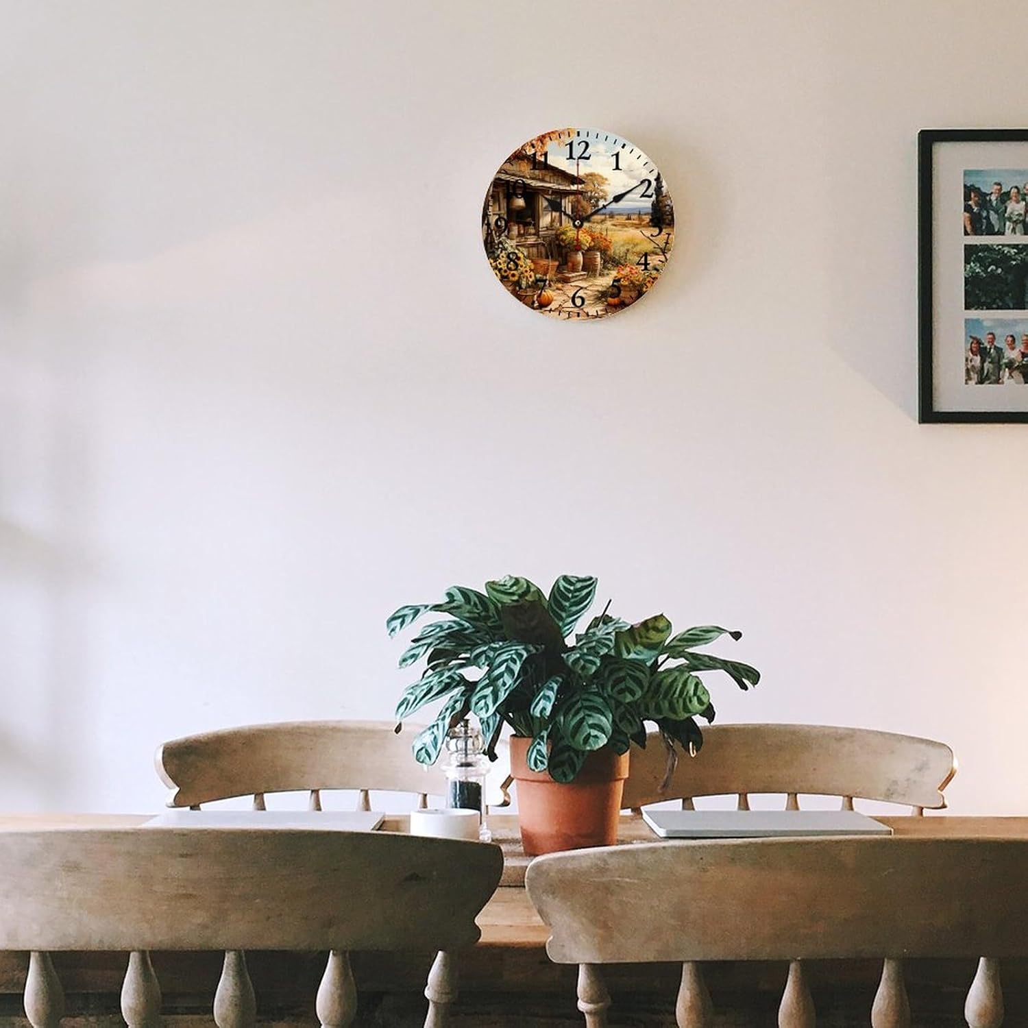 Seasonal Autumn Harvest Vintage Thanksgiving Kitchen Wall Clock 12 Inch Farmhouse Antique Silent Non Ticking Battery Operated Vintage Country Rustic Distressed Wood ClockLarge Number-Large numbers, easy to see from a distance or sideMetall Hands-The precise metal hands tell the time exactly, durableMetall Hands-The precise metal hands tell the time exactly, durableSuper Quiet-Quiet sweep second hand, no"TICK TOCK" to ensure a good sleepingBattery-Requires one AA battery (not included in the package)Easy to Hang-Back slot design offers easy installation, 1 non-track hook includedLarge decorative round wall clock is perfect for office ,living room, classroom, bedroom, bathroom.Please check it before usePlease check that the second hand is bent before use.All our products are strictly inspected,but this problem is unavoidable in the course of transportation.If the hands are curved, you can adjust them directly with your hands to keep them parallel.We apologize for the inconvenience.