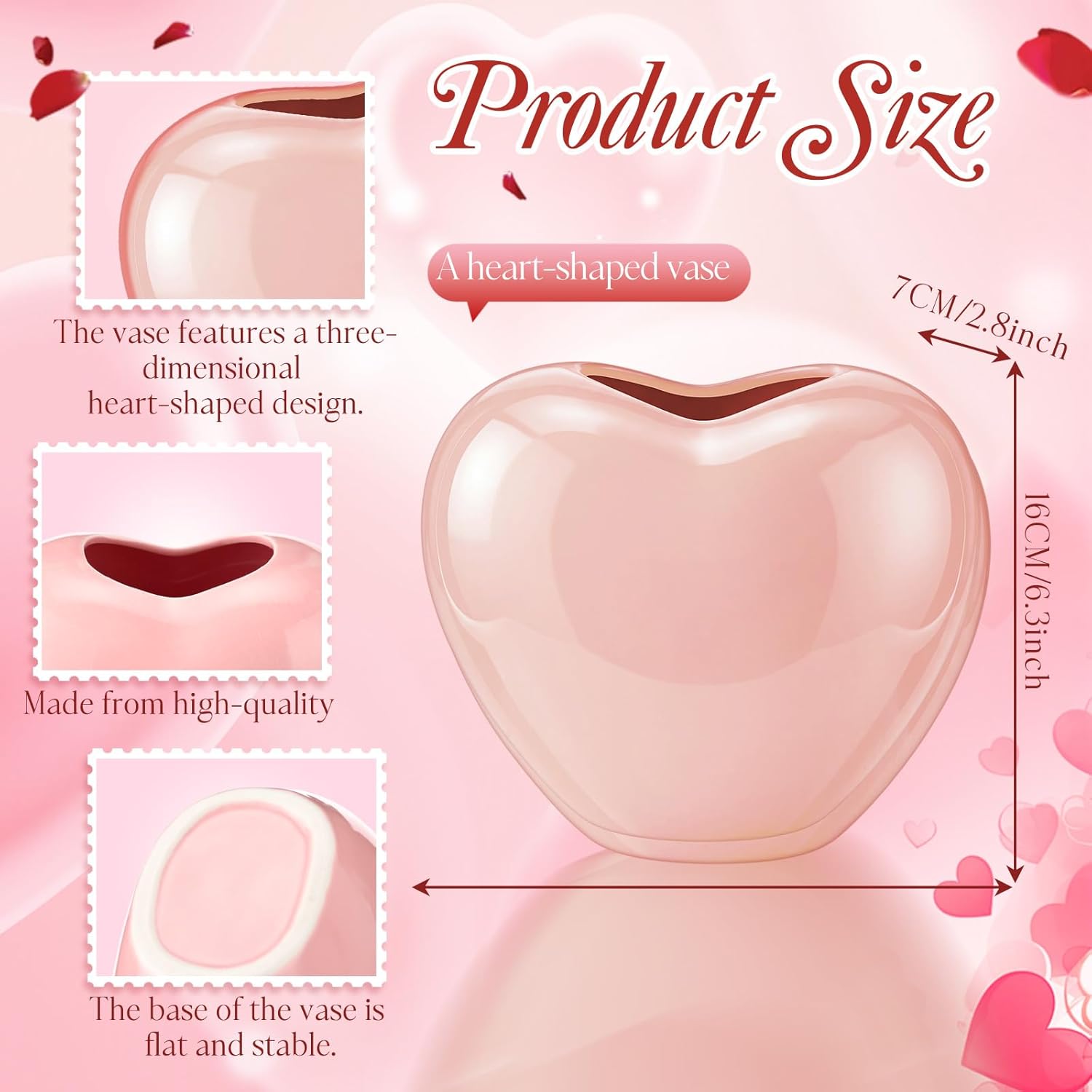 Features: Made from high-quality ceramic with a smooth glazed finish, this heart vase is sturdy, reusable, and designed to last Celebrate love with this beautiful heart-shaped vase set. Its elegant curves and vibrant pink berry stems create a romantic atmosphere suitable for Valentine's Day, anniversaries, or weddings Specifications: Material: ceramic Color: pink Size: Heart vase: 6.5 × 5.5 × 3.1 inches Berry branches: 11.8 inch Package includes: 1 x Valentine's Day Heart Vase 4 x Berry branches Notes: Manual measurement, please allow slight errors on size. The color may exist a slight difference due to different screen displays.