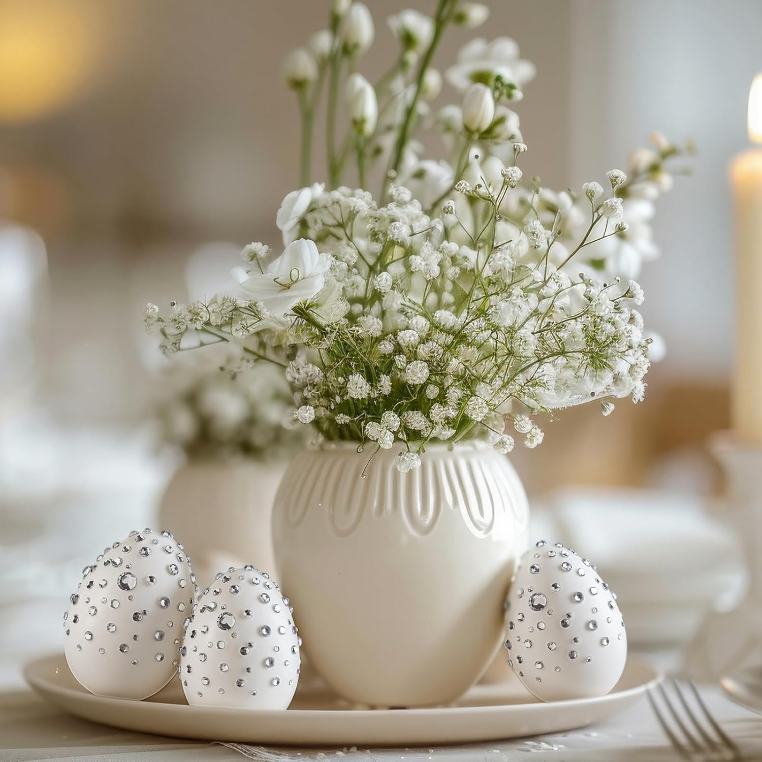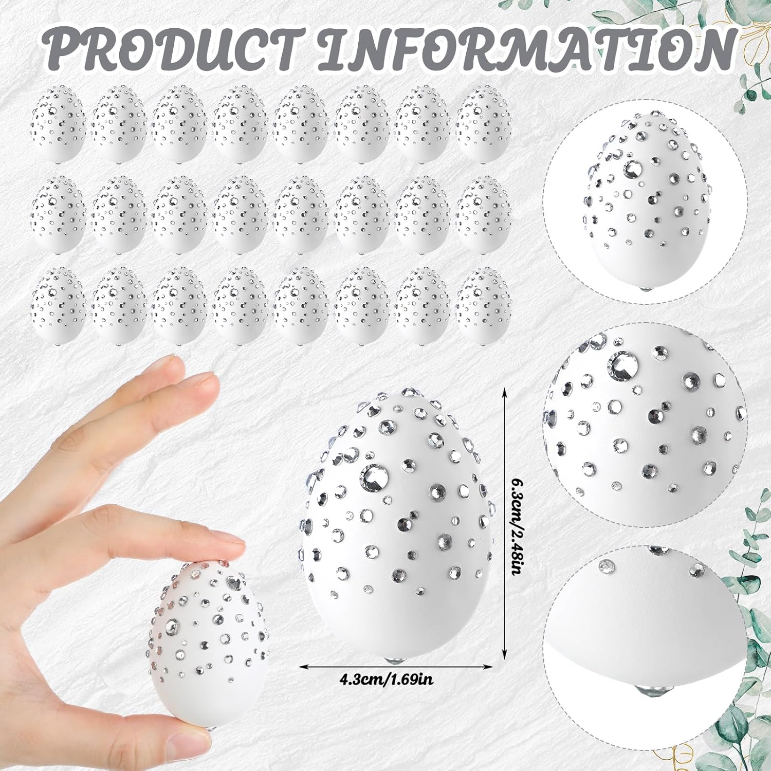 Features: Not only are these Easter decorative eggs ideal for Easter, but their timeless design makes them suitable for other celebratory occasions as well. Whether as a centerpiece, a part of your table setting, or an outdoor decoration, these eggs add a festive charm wherever placed Each meticulously designed in distinctive rhinestone patterns, you'll have ample options. These pieces accentuate the traditional essence of Easter and effortlessly blend with your seasonal decorations Specifications: Material: plastic rhinestone Color: white Size: 1.8 X 2.4 inches/4.5 x 6 cm Package includes: 24 X rhinestone Easter eggs decorations Notes: Manual measurement, please allow slight errors on size. The color may exist a slight difference due to different screen displays.