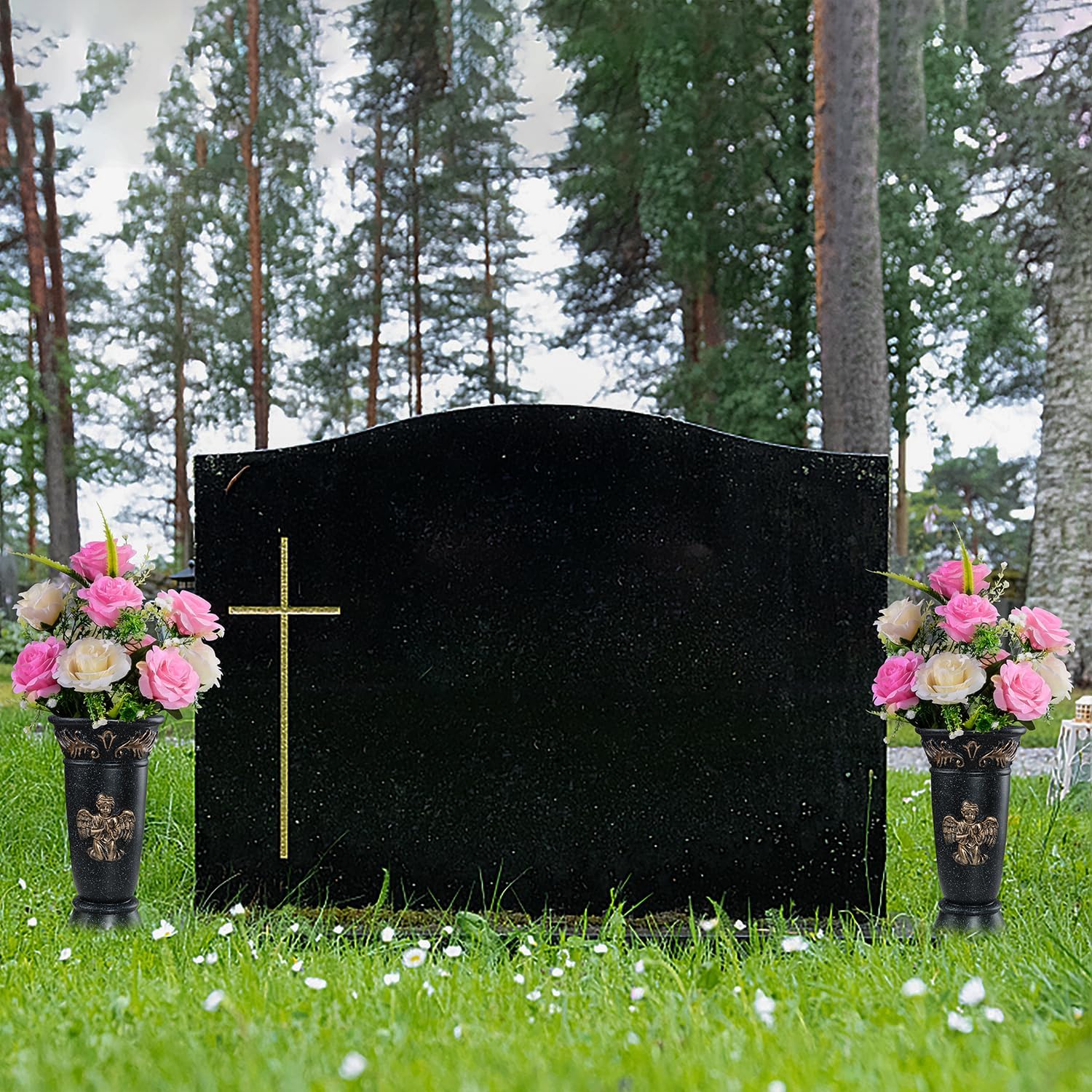 Memory with a Cemetery Vase When our loved ones pass, our special tributes keep their memory alive. Just show your love and sympathy with our flower cemetery vase! Express your thoughts about the loved one you have lost through words. With Drainage Hole & Wide Mouth The angel design memorial vase measures approx. 9.8 inches in height, 4.5 inches in width, the total length is 14.5 inches (including the size of stake), large enough to hold various flowers. Come with drainage hole at the bottom of the cemetery vase to drain water in time. Cemetery Vase as a Funeral or Memorial Gift Our resin black flower vase is available in an angel design that will look beautiful on any memorial site. Decorating their headstone with a cemetery vase filled with gorgeous artificial or fresh flowers. Features: Nice gifts: These graveside flower holders are suitable for sending to your friends, family members, colleagues, relative, neighbours and others who lost their loved ones, they will be grateful to receive these gifts. Exquisite design: The memorial flower vase is designed with an Angel in prayer pattern, which is a thoughtful and sensitive gift to show your condolences for the loss of a loved one. Specifications: Material: resin Color: Black Our flower vase is perfect for funerals, cemeteries and gravesites or perfect as a sympathy gift, bereavement gift, or to comfort someone who is missing someone. Package include: 1 Resin flower cemetery vases 2 Metal spikes