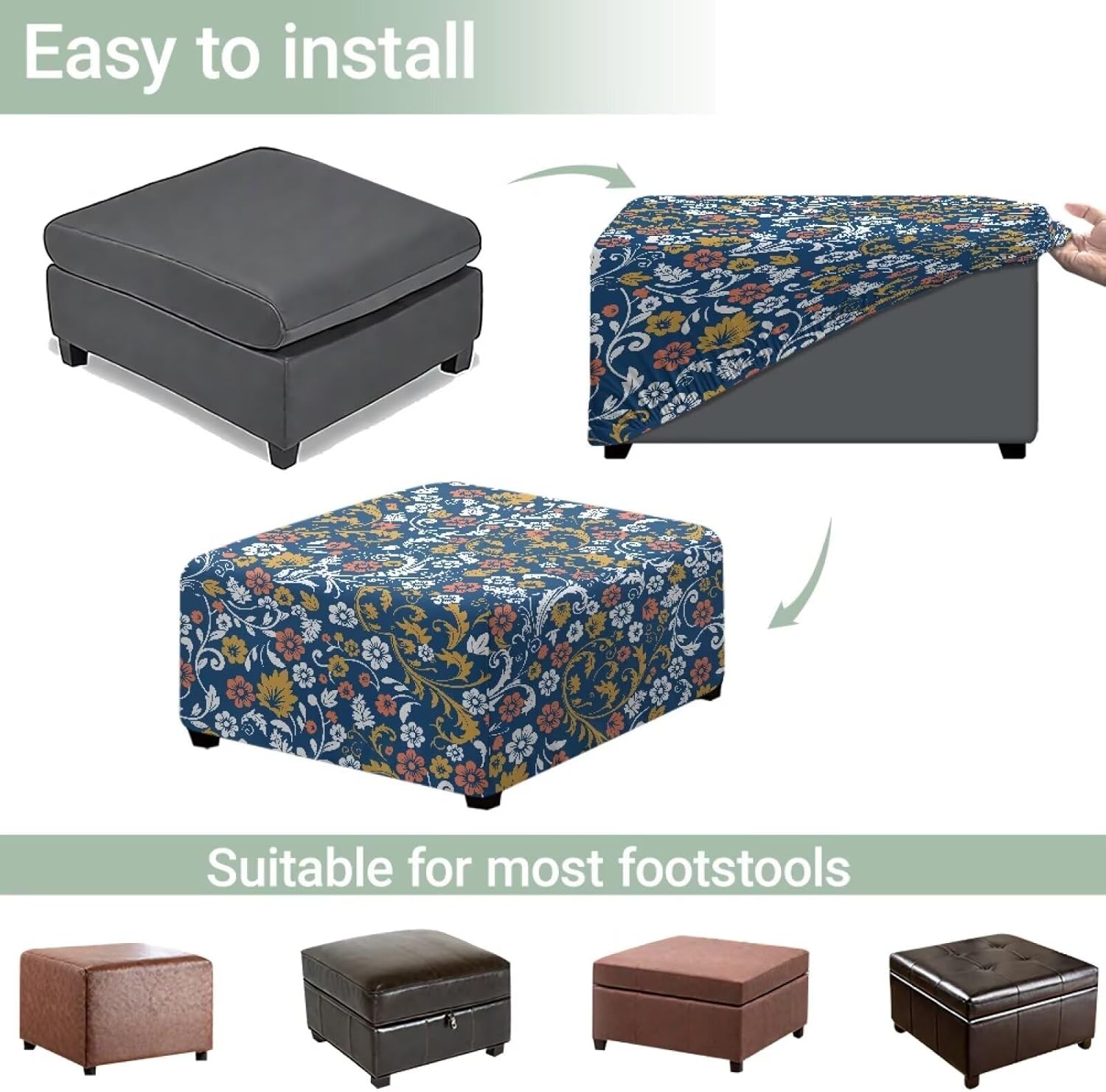 Upgrade Your Home Decor with Our Stylish Footstool Cover Tired of your old, worn-out footstool? Our Footstool Cover is the perfect solution to breathe new life into your furniture. Designed to fit most standard-sized footstools and ottomans. This cover offers a seamless blend of functionality and style. Whether you’re looking to protect your footstool or simply refresh your living space, this cover is a must-have addition to your home. - Size Small size- 17"-22"L x 17"-22"W x 17"-18"H (43.17- 55.87 cm x 43.17- 55.87 cm x 43.17- 45.71 cm). Large size- 27"-32"L x 27"-32"W x 17"-18"H (68.57- 81.27 cm x 68.57-81.27 cm x 43.17-45.71 cm) - Universal Fit for Most Footstools Featuring a stretchable design with elastic edges, our footstool cover can easily adapt to square footstools. The snug fit ensures a smooth, wrinkle-free appearance, giving your furniture a polished and professional look. - Great Material for Comfort The high-quality polyester fabric is soft, comfortable and fade-resistant, and designed to withstand daily use, making it a practical and long-lasting choice for home. - Easy to Clean & Maintain Simply toss it in the washing machine on a gentle cycle, and it will come out looking as good as newmakes it ideal for households with kids and pets. - Versatile & Stylish Design Various of patterns make it a versatile decor piece that complements any interior style.