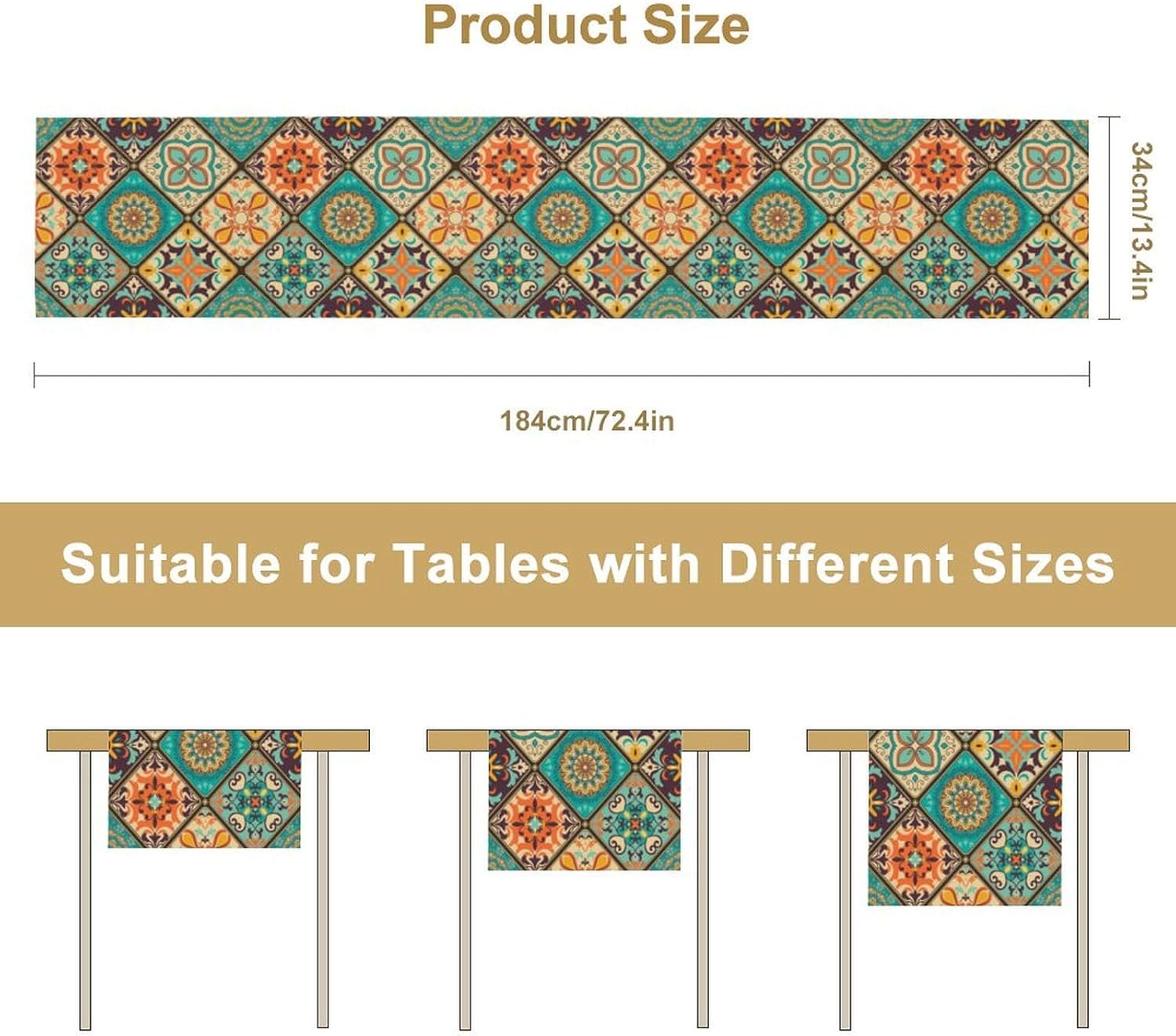 Applicable scenarios: You can place it anywhere you want, it can be used as a placemat, party decoration, kitchen, dining table, living room, picnic, barbecue and other places. It is also a good choice. Tips: There are 6 lengths for you to choose from, and manual measurement may have a 1-2cm error. Please carefully check the measuring table before purchasing this product. If the length you want is not available here, please contact us and we will customize it specifically for you. Product sizes include: 13x16 inches, 13x60 inches, 13x70 inches, 13x90 inches, 13x108 inches, and 13x185 inches.