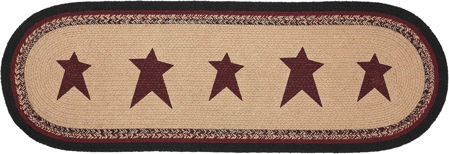 Enhance your dining room or kitchen decor with the VHC Brands Braided Cotton Table Runner from the Connell Collection. Measuring 12x36 inches, this oval table runner is the perfect addition to your farmhouse-style table setting. Crafted with a braided style design and high-quality recycled cotton, it adds a touch of primitive and country charm to your space. The Connell Collection Braided Cotton Table Runner features stenciled stars in rich burgundy, making it an eye-catching accent for your dining table. Whether you're hosting a formal dinner or a cozy meal, this runner complements your decor with its rustic appeal. The braided texture and oval shape provide a unique and textured surface for your table setting, elevating your dining experience. Not only does this table runner enhance your dining decor, but it also offers practicality and durability. It's easy to clean and can withstand daily use, making it an ideal choice for busy households. Elevate your dining space with the Connell Collection Braided Cotton Table Runner, a versatile accent that seamlessly blends primitive and country styles while adding warmth and style to your home.