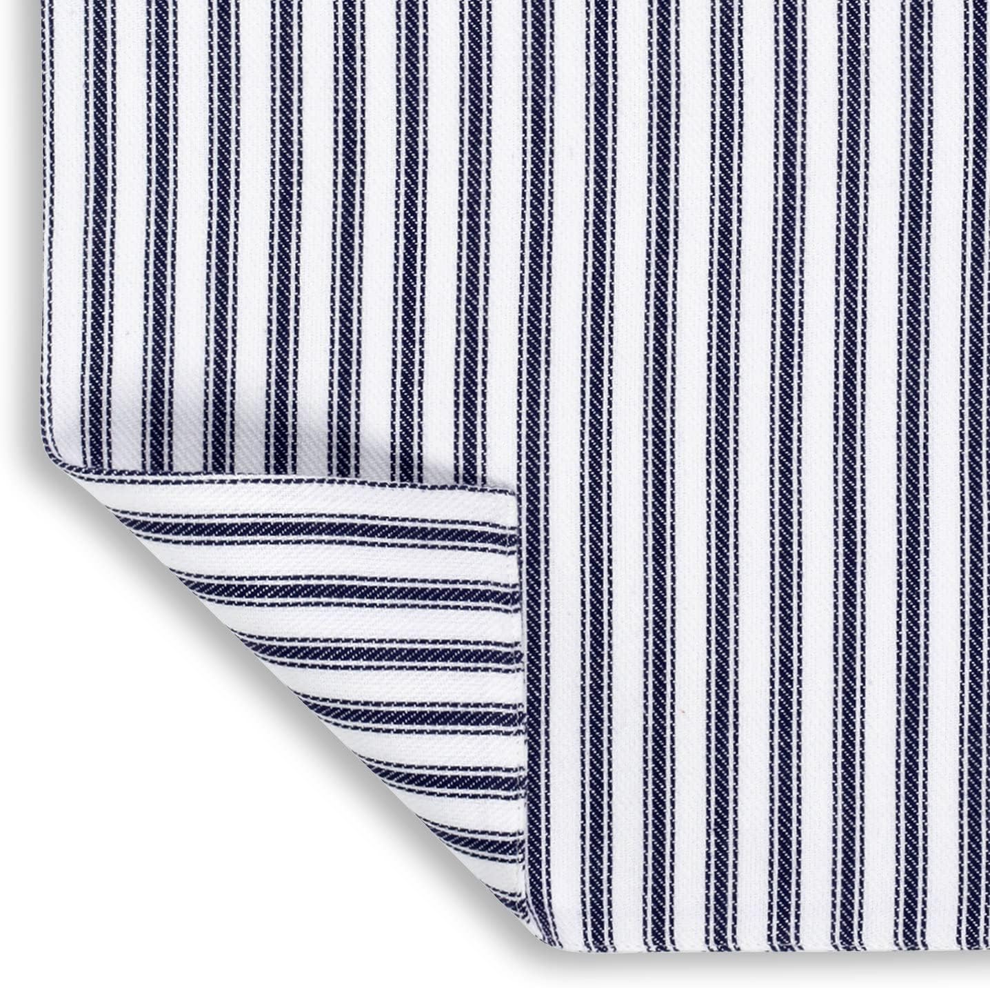 Classic woven navy blue and white ticking stripe table runner. Measures 14 x 72 inches. 100% cotton. Machine wash cold, line dry. Made in India. This beautiful runner will add style to your table, buffet, dresser, or chest. Matching placemats and tablecloth available separately. Complements both traditional and contemporary home decor.