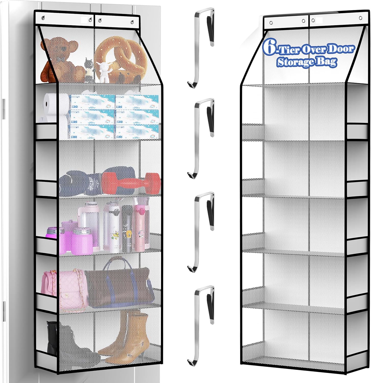 "Transform your home organization with our Heavy-Duty Over the Door Shoe Organizer. This versatile hanging storage solution boasts an impressive 89 lbs weight capacity, making it perfect for holding shoes, accessories, and much more. The innovative design includes 6 large front pockets and 12 clear mesh side pockets, offering ample space for everything from kids' toys in the nursery to toiletries in the bathroom. Easily install it over any standard door in seconds—no tools required. Experience a clutter-free bedroom, organized closet, tidy pantry, and neat dorm room today!"