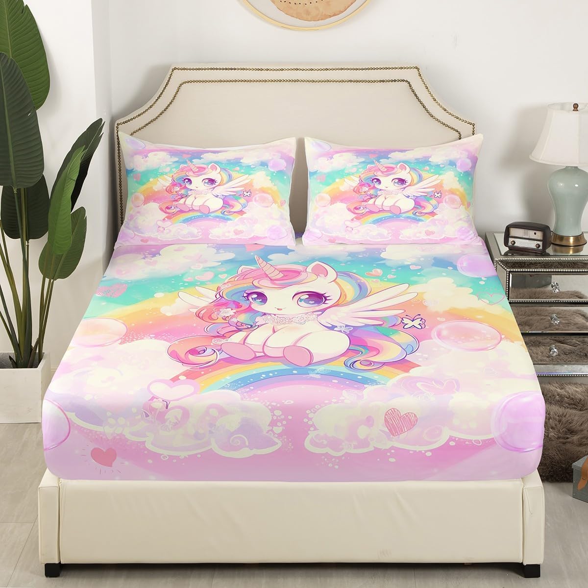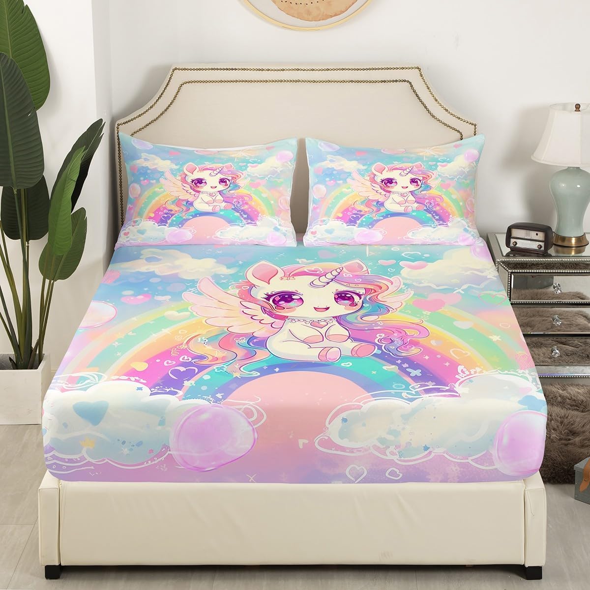 Package Include:1 x fitted sheet,2 x Pillowcases. Fitted sheet set pattern bedding set, simply decorating your rooms any time you want, bringing you fresh feel for year round use. Made from polyester,the sheet set offers long lasting strength,anatural resistance to shrinking and a noticeably soft hand feel. Size Information: Twin size : 1 Fitted Sheet 39"W x 75"L x 16"H ,99 x 190 x 41cm , 1 pillowcase 20" x 30", 51x75cm . Full size : 1 Fitted Sheet 54"W x 75"L x 16"H ,137 x 191x 41cm ,2 pillowcases 20" x 30", 51 x 75cm . Queen size : 1 Fitted Sheet 60"W x 80"L x 16"H ,152 x 203x 41cm ,2 pillowcases 20" x 30", 51 x 75cm . Personalize your bedroom: Beautiful design and colorful print, makes your bedroom unique and brings you a wonderful dream. Washing instructions: Machine wash separately in cold water,hang dry, do not bleach. Occasion: The soft Fitted Sheet bedding sets designed for Children ,Adult, Men, Women, Teens. This Fitted Sheet set is also suitable for full seasons, Spring, Summer, Autumn and Winter. Attention: Due to manual measurement, there may be an error of 1-3 centimeters.