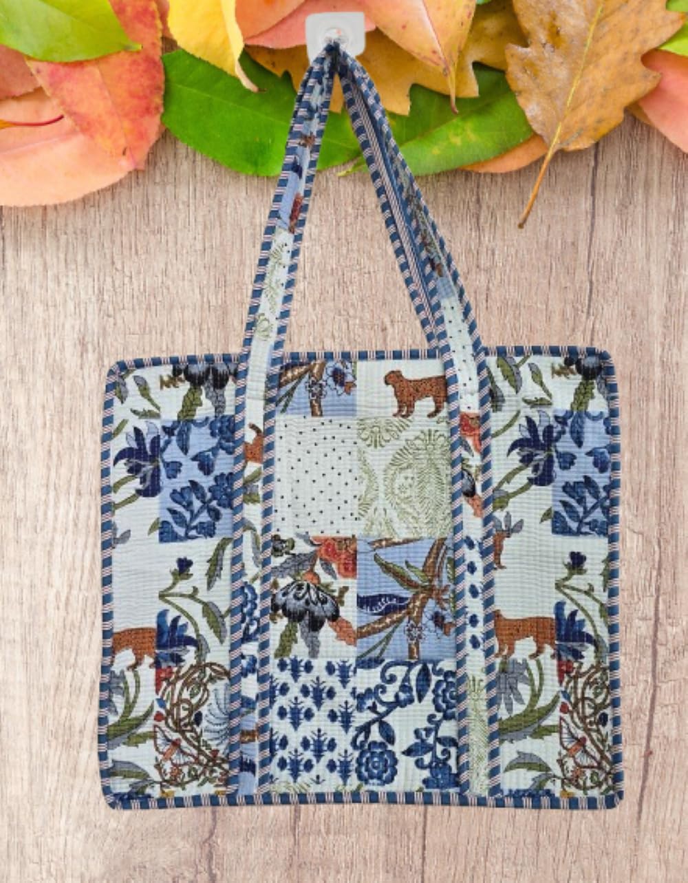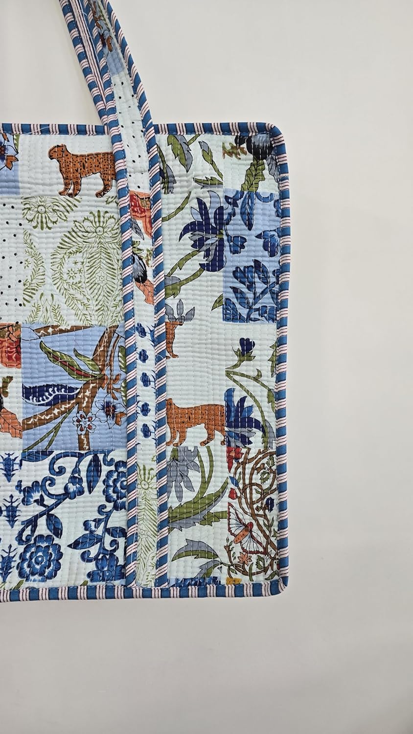 Add a vibrant pop of color to your everyday errands with this beautifully quilted cotton tote bag. The eye-catching colorfull features an intricate paisley and floral design in rich shades of blue, green, burgundy and many more, creating a stunning visual appeal. The bag's quilted construction provides structure and durability, while the striped binding adds a charming finishing touch. With comfortable long handles, this versatile tote is perfect for shopping trips, market visits, or as a stylish everyday carry-all. The roomy interior offers plenty of space for groceries, personal items, or travel essentials. The cotton construction makes it lightweight yet sturdy, and the quilted pattern not only enhances its aesthetic appeal but also adds an extra layer of stability. This tote combines functionality with fashion, making it an ideal companion for both practical errands and casual outings. The classic design ensures it will complement any outfit while serving as a reliable shopping companion.