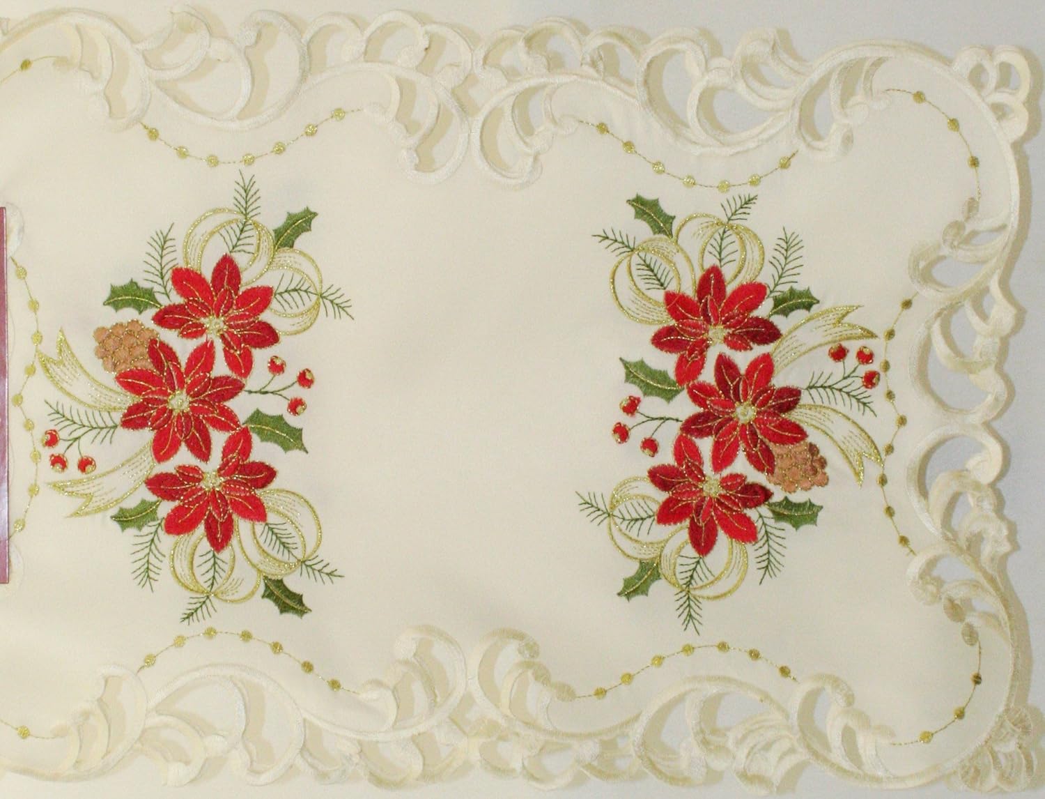 This beautiful Christmas table top program is offered in a variety of sizes to accent any dining, accent or end table. The ivory background is adorned by poinsettias, holly, berries, gold ribbons and pinecones.