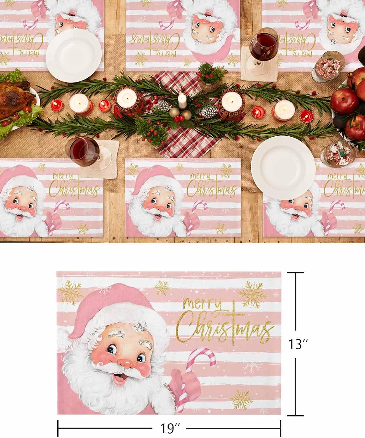 Christmas Placemats for kitchen table/Xmas Place Mats for dinner table/Santa Claus Placemats for dining table Christmas pink place mats with unique design adds a fresh atmosphere to your table and decorating needs whether it is for dining, coffee, or entryway table. Set the scene this spring with romantic placemats, perfect table decorations Great Christmas table mats for tea cups, bowls, glasses, etc. Made of Polyester, heat insulation, skid-proof, wearproof Perfect for daily use, great accessory for household or other places. Non-slip, can be used to table mat, pot holder, and so on Unique pattern design, the pattern is only on the front side, the back without any patterns Premium Material: Polyester Available Size: 19"X13" (48cmX33cm) Widely Occasions: Home, Tea House, Cafe, Hotel, Wedding, Party, Christmas Day etc. Package List: 4pcs Place Mats OR 6pcs Place Mats (not including other accessories) Warm Tips: 1) All mats are manual measurement, there may be 1-2cm deviation exist 2) Actual color may be a slight difference between the monitor display picture because of the light brightness