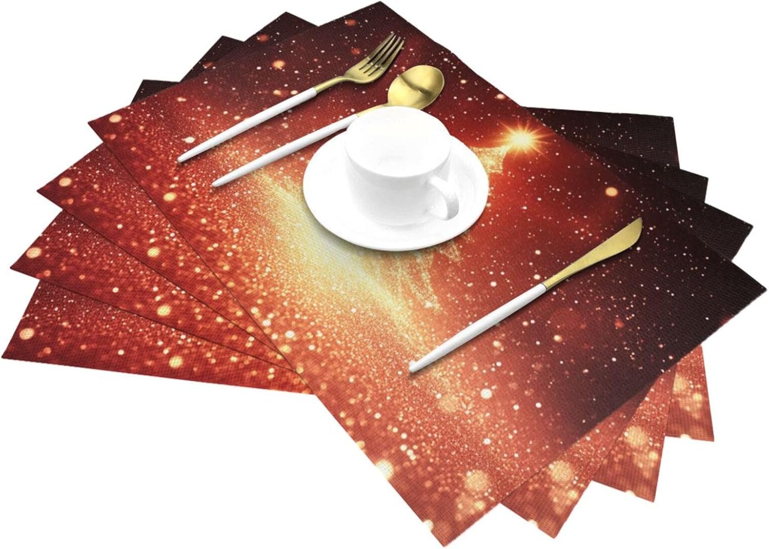 SizeClassic 12 x 18 inch ( 31x 46 cm)Suitable for any size dining table.Package included4pcs placemats.MaterialPremium and Eco-friendly PVCFeatherEasy to clean,non-fading,wipe clean,dry quickly,heatinsulation and non-slipHeat ResistantBetter protect your table from hot foods.Perfect DecorElegant and Beautiful placemats would be a good decoration andlife quatity for your home, dining hall, kitchen, hotel and business office.Easy to storeYou can roll themup or stack them flat for storage when not use.
