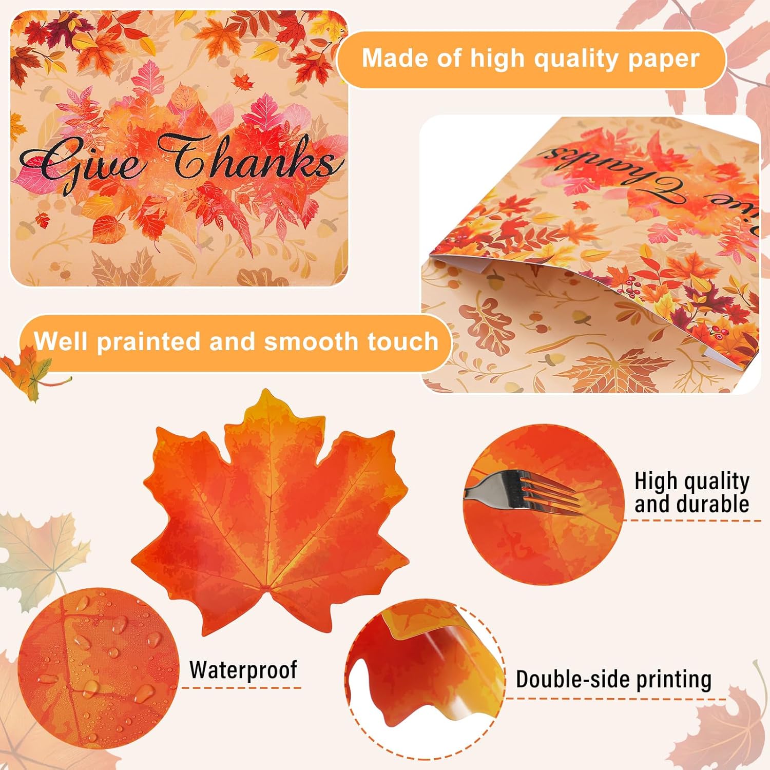Features: You can prepare paper mats for dinner as delicate gifts to your friends, neighbors or relatives when Thanksgiving Day is coming, showing your love and care. The thanksgiving paper placemats disposable are delicate and eye catching in appearance, can leave deep impressions on your guests, showing your good taste. Specifications: Main material: coated paper Main color: orange Size: Orange placemats: about 15.98 x 12.01 inches/ 40.6 x 30.5 cm Utensil holder for party: about 7.48 x 3.94 inches/ 19 x 10 cm Package includes: 50 x Orange placemats 50 x Utensil holders Notes: Manual measurement, please allow slight errors on size. The color may exist a slight difference due to different screen displays.