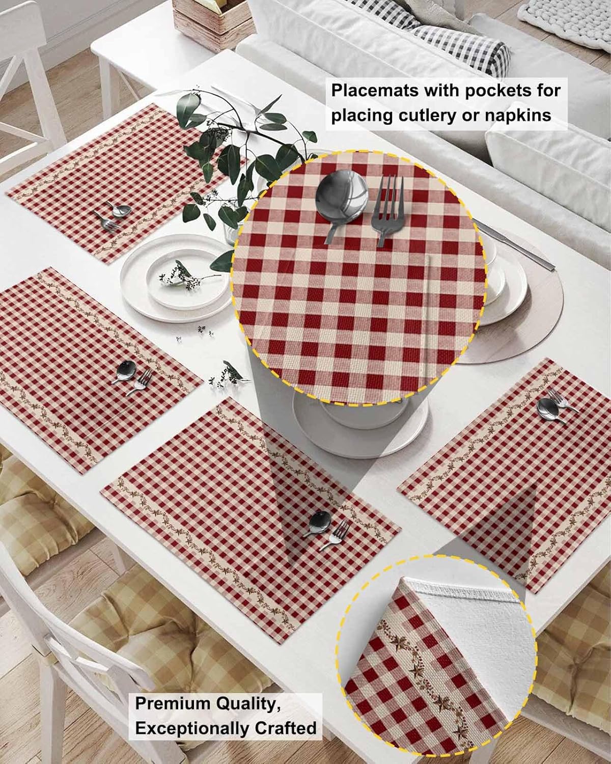 About Pocket Placemats Material: Made of microfiber polyester, lightweight and comfortable to touch, durable for long time use. Heat-proof: These table placemats can effectively insulate heat and protect your dining table well. Easy to Clean: Easy to wipe clean, if the placemat gets stains, please use a brush and soapy water to clean it. Printing: High-definition printing process makes the picture bright and clear, not easy to fade, and can be used with confidence. Widely used: Perfect for indoor and outdoor, such as home kitchen, restaurant, coffee shop, hotel, dining table, business office, party dinner, barbecue, wedding, etc. Specifications Dimensions: 13x19 Inches Quantity: 2-pack / 4-pack / 6-pack Shape: Rectangular Material: Polyester Notes - Due to the lighting and monitor display, the placemat color may be different from the picture, please understand - Due to manual cutting, there may be 0.1-2 inches error, please understand!