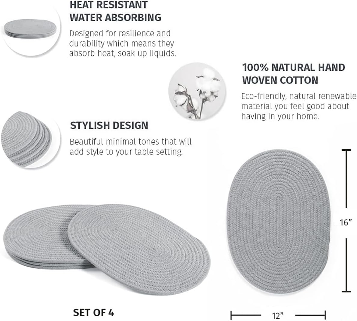 6 Pack Oval Woven Placemats - Fabric Place Mats, Heat-Resistant Non-Slip Tablemats, Washable Charger Plates for Table DecorationMaterial: Cotton WovenCrafted from 100% cotton rope, these placemats are designed to provide excellent heat protection for your kitchen table surface! Package Contents:Set of 4 PlacematsFeatures:1. Gentle hand wash recommended; do not machine wash or bleach. It is advisable to wash by hand and dry in the shade to prevent fading and prolong the lifespan of the product.2. Thick and durable construction ensures comfort while handling; they maintain their shape well after cleaning.3. Enhanced anti-slip design with water absorption and heat resistance properties. Both sides can be used for decoration, making them both beautiful and practical.4. These placemats serve multiple purposes: they can be utilized for tableware, cups, plates, vases, hot pots; as coasters, pot pads, meal pads, seat cushions; or even as play mats for children or pets. Add a touch of natural elegance to your restaurant counter, bar area or breakfast nook—perfect for cooking, baking, serving meals or dining occasions. Additionally, during Halloween、Christmas、weddings、and parties,they enhance your overall dining experience! Please Note: During transportation some deformation may occur due to compression; however,these placemats possess excellent plasticity and will quickly return to their original shape without concern.